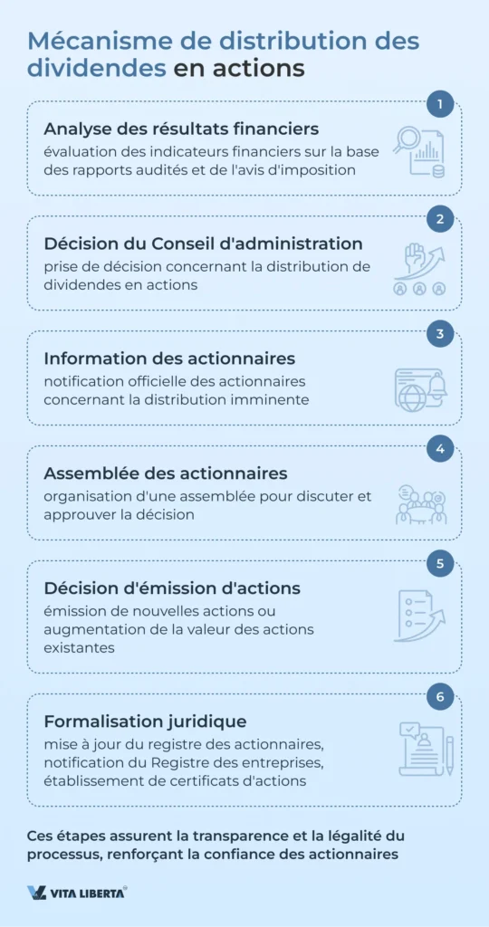 Le processus de distribution des dividendes en actions se compose de plusieurs étapes importantes, garantissant la transparence et le respect des exigences légales.