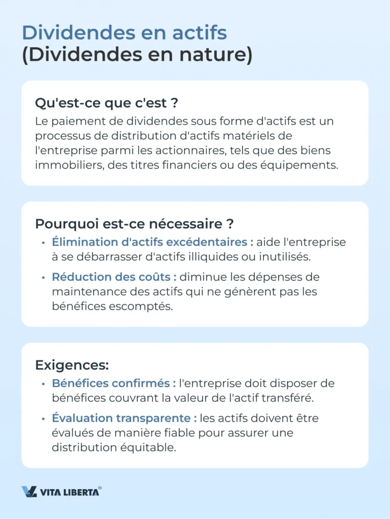 Pour procéder au paiement de dividendes en actifs, l’entreprise doit disposer de bénéfices confirmés couvrant la valeur de l’actif transféré. L’évaluation de l’actif doit être fiable et transparente afin d’assurer une distribution équitable parmi les actionnaires.
