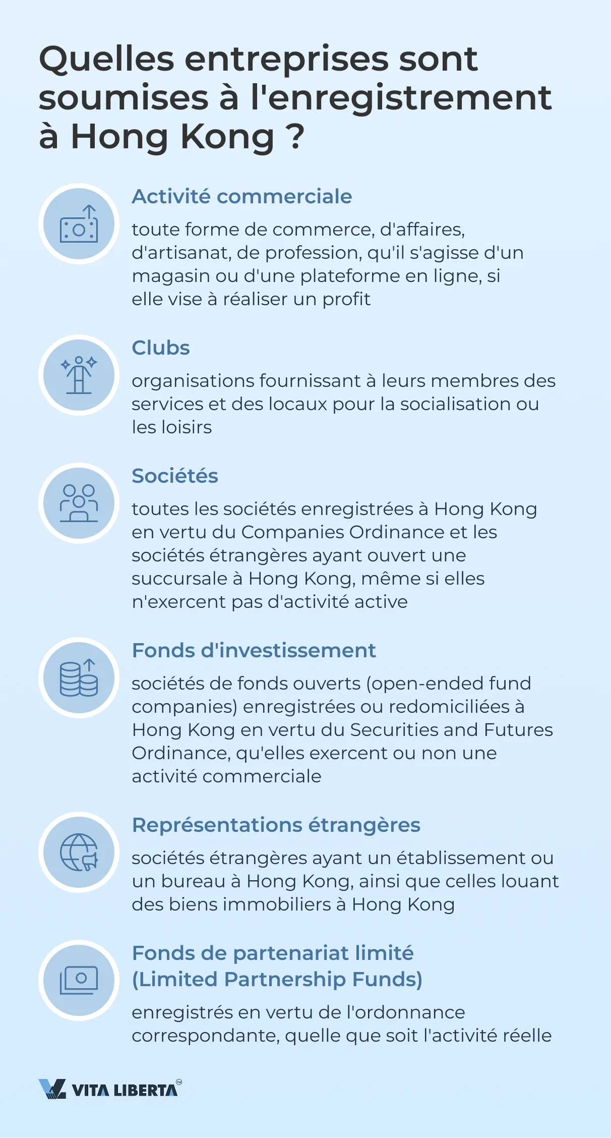 À Hong Kong, le terme « entreprise » couvre toute activité exercée dans un but lucratif, y compris le commerce, les affaires, l’artisanat, les professions ou les clubs. Selon le Companies Ordinance (chapitre 622), chaque société locale ou étrangère inscrite à Hong Kong, ainsi que les sociétés de fonds ouverts et les fonds de partenariat limité enregistrés ou redomiciliés à Hong Kong, sont considérées comme exerçant une activité commerciale et doivent être enregistrées conformément à la Business Registration Ordinance (BRO). Cela s’applique également aux sociétés étrangères ayant un établissement ou un bureau à Hong Kong, ou louant des biens immobiliers à Hong Kong.