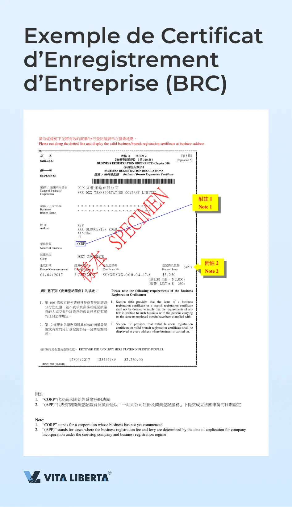 Le BRN (Business Registration Number) est un numéro unique à huit chiffres attribué à chaque société à Hong Kong pour son identification auprès de l’administration fiscale. Il est contenu dans le certificat d’enregistrement d’entreprise et en fait partie intégrante.