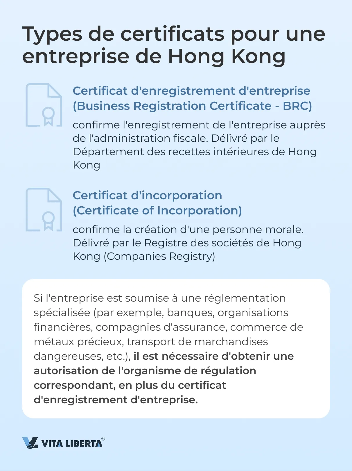 Dans certains cas, l’enregistrement d’une entreprise à Hong Kong ne se limite pas à l’obtention du seul BRC. En fonction de la nature des activités de votre société, vous pourriez avoir besoin de licences ou d’autorisations supplémentaires. Cela est particulièrement pertinent pour les sociétés opérant dans des secteurs tels que la finance, le commerce de détail ou l’éducation.