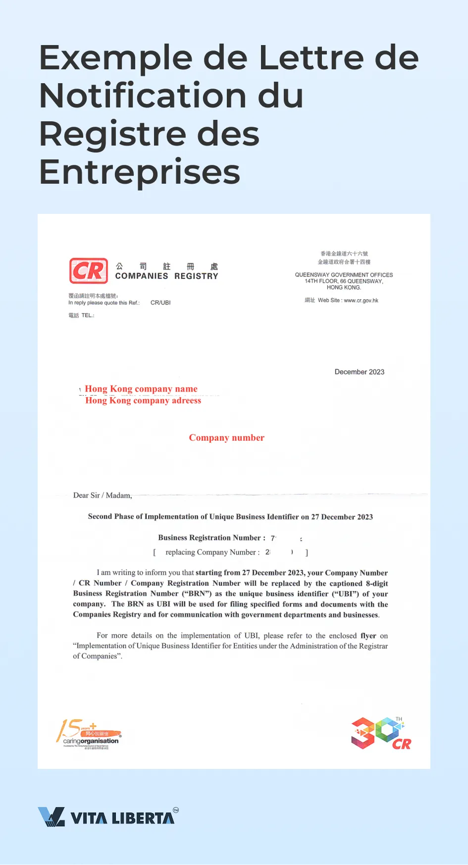 Grâce aux efforts conjoints du Département des recettes intérieures, à partir du 27 décembre 2023, le numéro d’enregistrement d’entreprise (BRN) à Hong Kong, représentant les 8 premiers chiffres du numéro du certificat d’enregistrement attribué par le Département des recettes intérieures, est adopté comme identifiant d’entreprise unique (UBI). Ce numéro sera utilisé comme un identifiant unique pour soumettre des formulaires et des documents au Registre des sociétés (Companies Registry), ainsi que pour interagir avec les départements gouvernementaux et les entreprises.