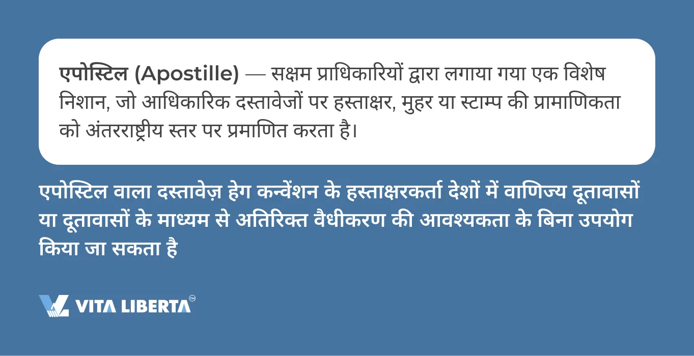 एपोस्टिल एक विशेष मुहर है जो दस्तावेज़ पर हस्ताक्षर, मुहर या स्टाम्प की प्रामाणिकता की पुष्टि करता है, साथ ही हेग कन्वेंशन में भाग लेने वाले अन्य देशों में उपयोग के लिए इसकी कानूनी वैधता की भी पुष्टि करता है। एपोस्टिल जटिल वाणिज्य दूतावासीकरण की आवश्यकता को समाप्त कर देता है, जिससे अंतरराष्ट्रीय दस्तावेज़ प्रवाह काफी सरल हो जाता है। उदाहरण के लिए, एपोस्टिल किए गए कॉर्पोरेट दस्तावेज़ों का उपयोग बैंक खाते खोलने, विदेशों में निविदाओं में भाग लेने और अन्य आधिकारिक प्रक्रियाओं के लिए किया जा सकता है।