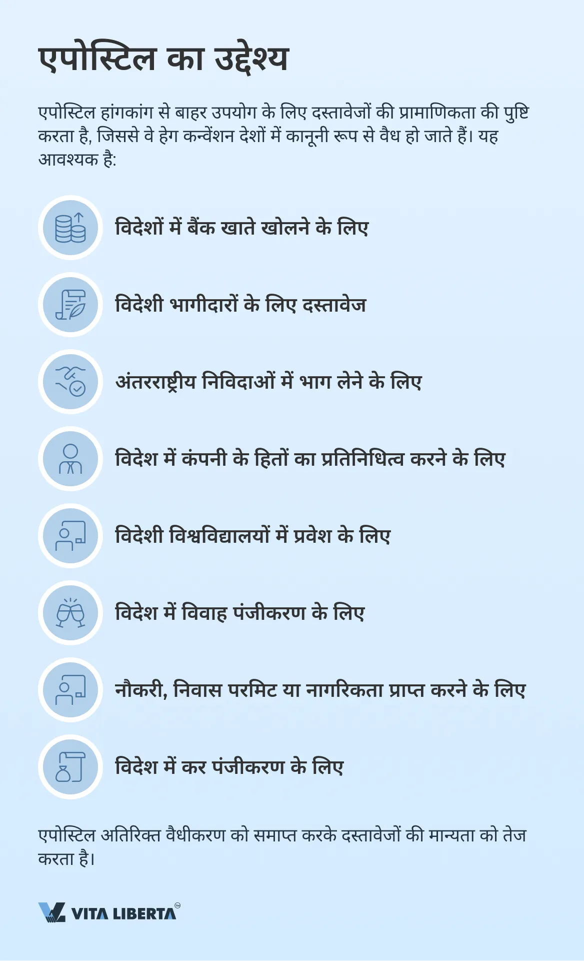 दस्तावेजों के एपोस्टिल की आवश्यकता हांगकांग से बाहर उनकी आधिकारिक मान्यता और उपयोग के लिए होती है। यह दस्तावेजों की प्रामाणिकता की पुष्टि करता है और उन्हें हेग कन्वेंशन पर हस्ताक्षर करने वाले अन्य देशों में कानूनी रूप से वैध बनाता है। एपोस्टिल की आवश्यकता वाले मुख्य मामलों में शामिल हैं: