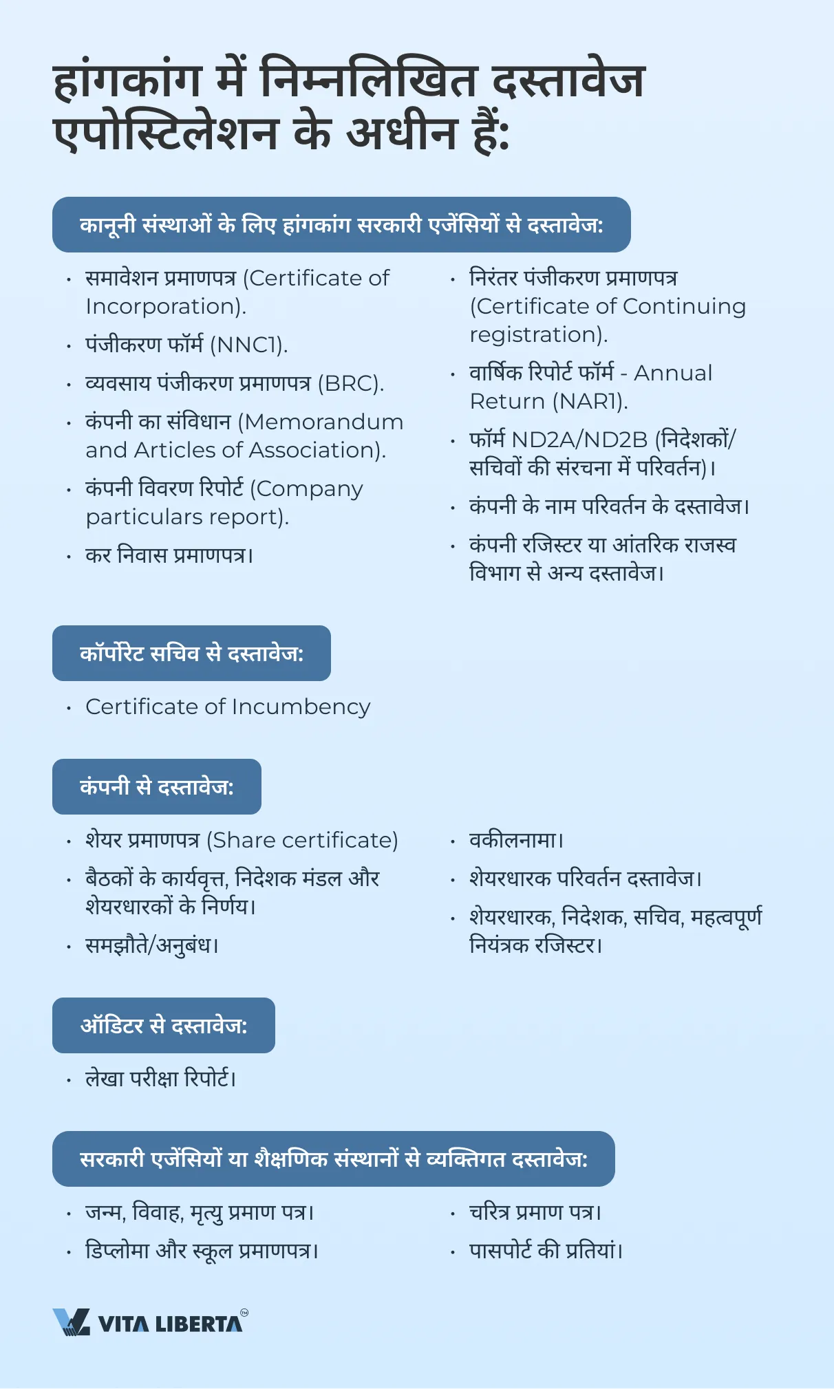 हॉन्ग कॉन्ग में विभिन्न कॉर्पोरेट दस्तावेज़ों को एपोस्टिल किया जा सकता है, जिनमें शामिल हैं: