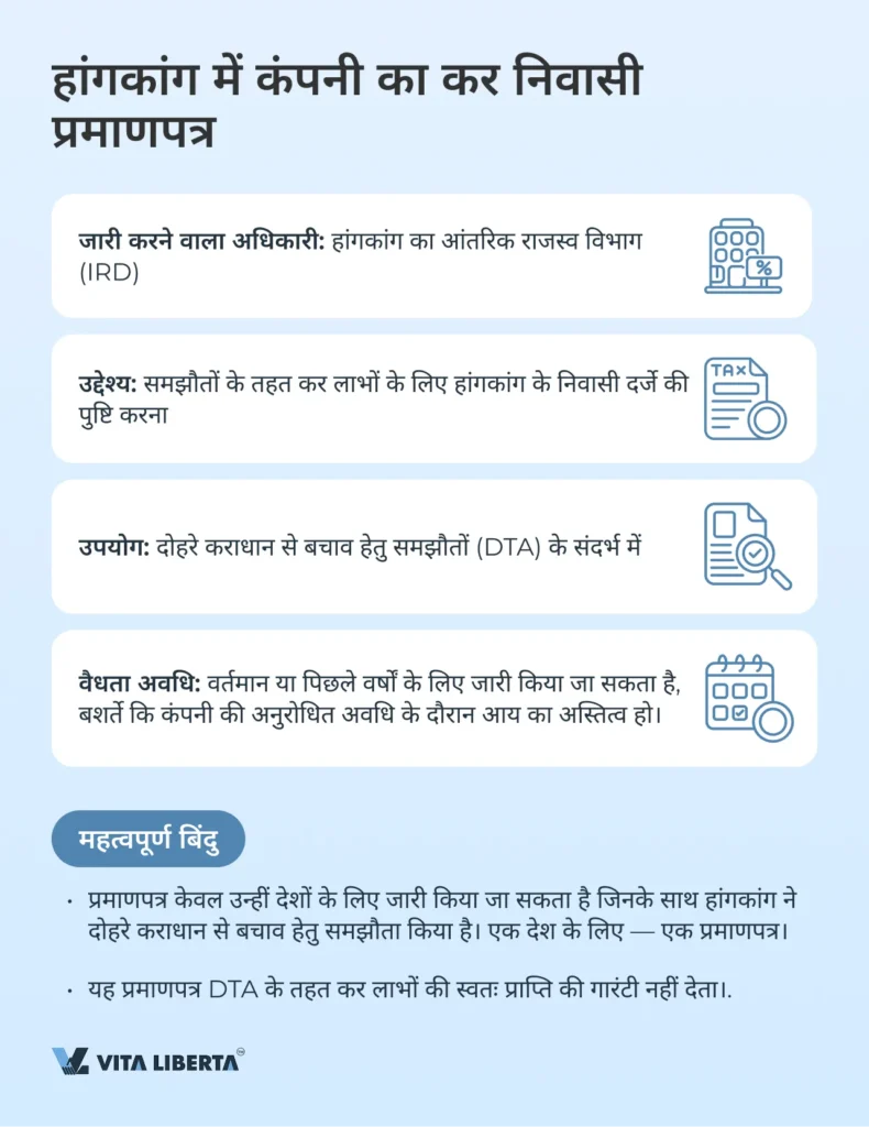 यह प्रमाणपत्र हांगकांग के निवासी दर्जे के प्रमाण के रूप में कार्य करता है तथा उस देश के संबंध में वर्तमान या पिछले वर्ष के लिए जारी किया जा सकता है, जिसके साथ हांगकांग ने दोहरे कराधान से बचाव हेतु समझौता किया है।