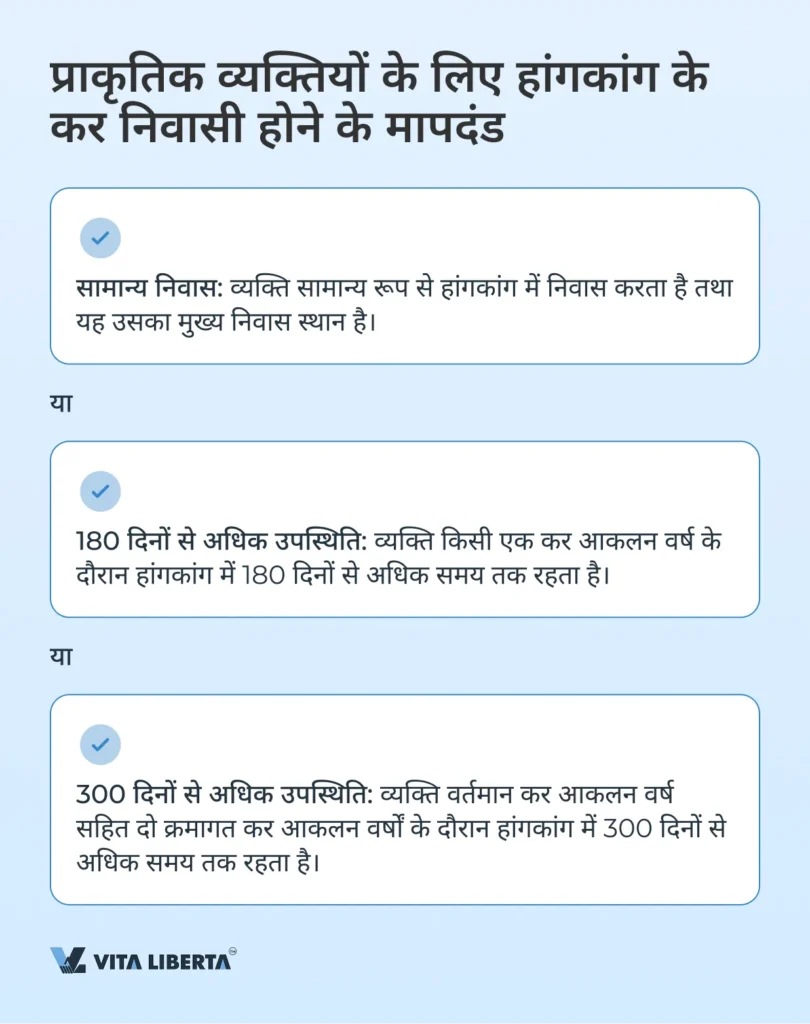 - एक वर्ष में 180 दिनों से अधिक अवधि तक हांगकांग में उपस्थिति: व्यक्ति किसी एक कैलेंडर वर्ष (कर आकलन वर्ष) के दौरान हांगकांग में 180 दिनों से अधिक समय तक रहता है।