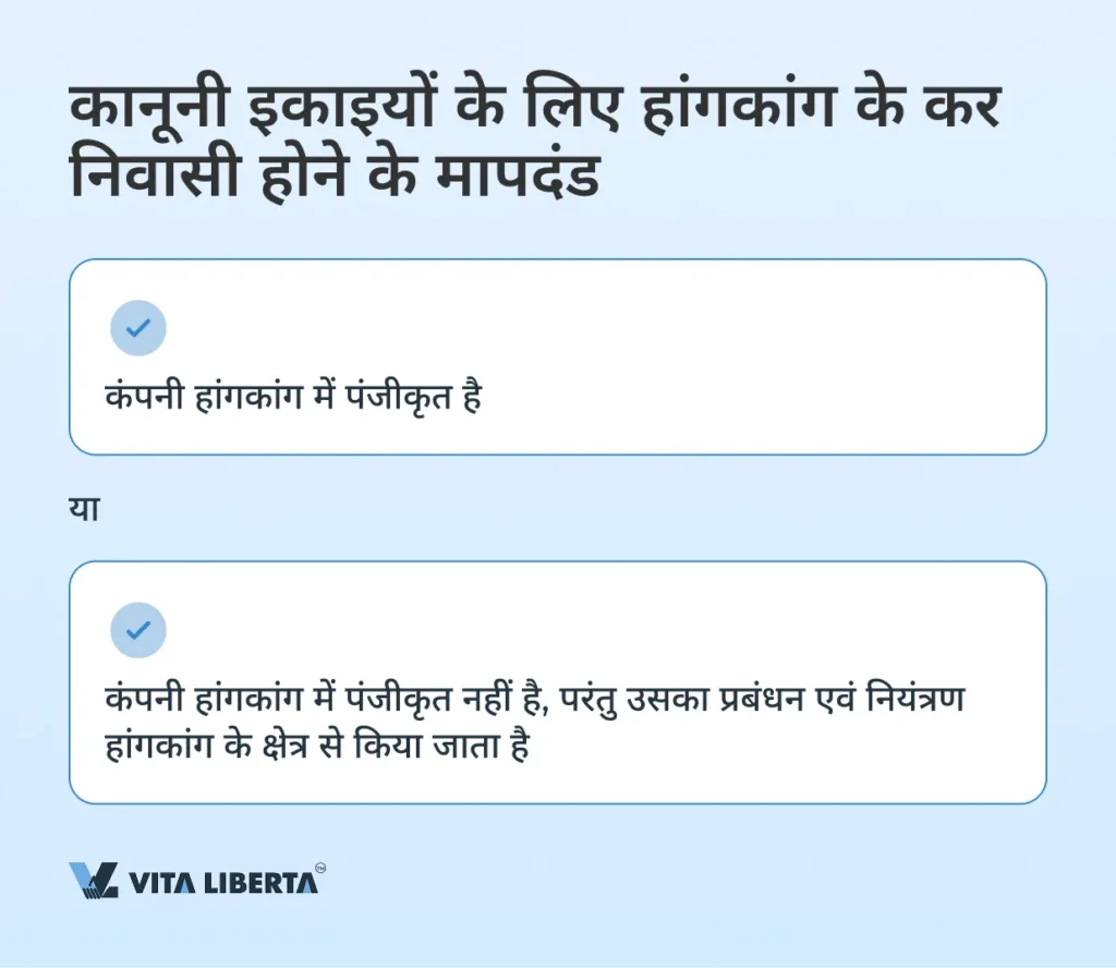 कानूनी इकाइयों (यानी कंपनियों) के लिए मापदंड कुछ भिन्न हैं, और निम्नलिखित शर्तों में से किसी एक के पूरा होने पर कंपनी को हांगकांग की कर निवासी माना जाता है: