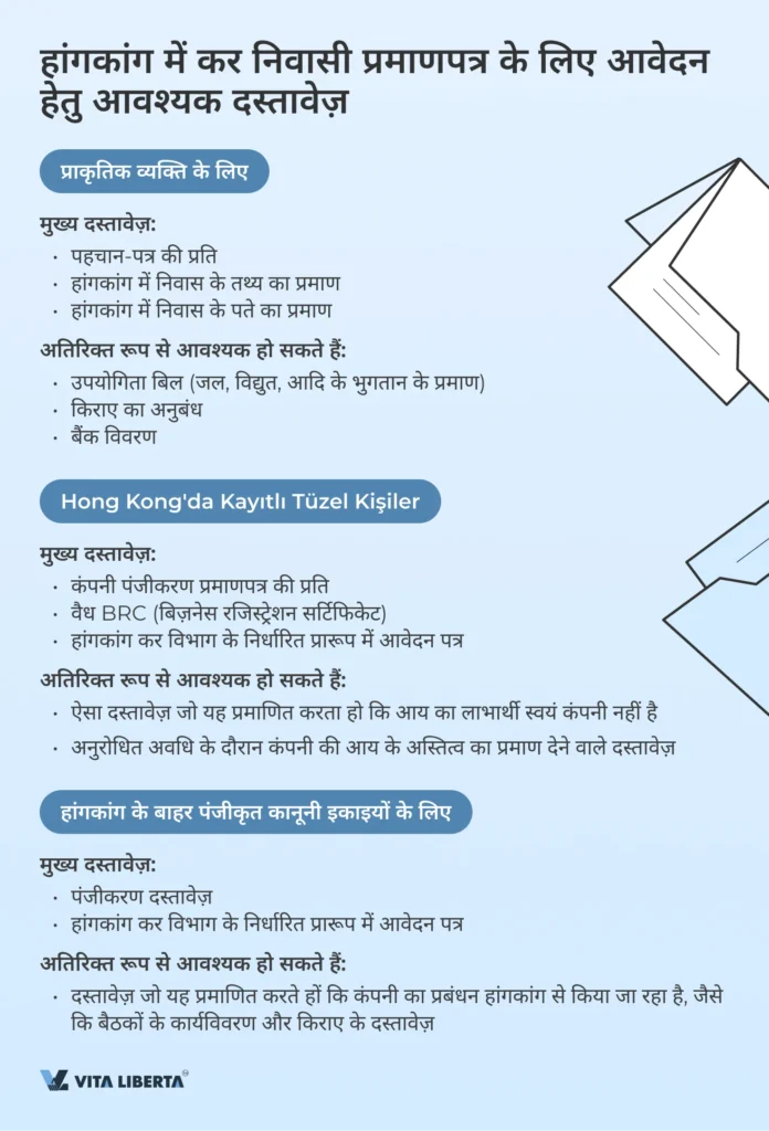 - हांगकांग कर विभाग के द्वारा निर्धारित प्रारूप के अनुसार आवेदन पत्र