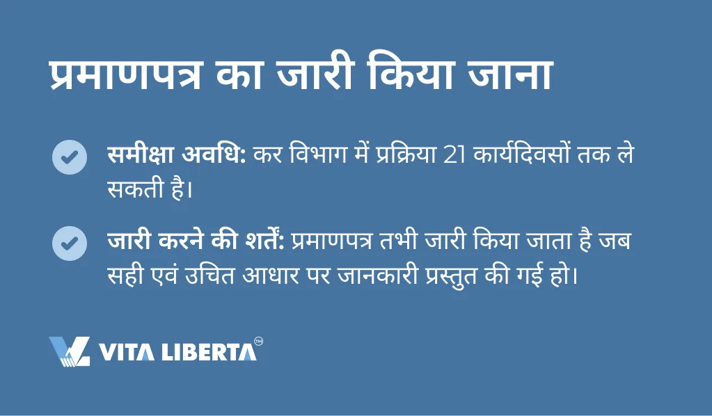 आवेदन जमा करने के पश्चात्, हांगकांग के कर विभाग द्वारा आवेदन की समीक्षा की जाती है और आवश्यकता पड़ने पर अतिरिक्त जानकारी की माँग की जा सकती है। यदि प्रस्तुत की गई जानकारी सही एवं उचित आधार पर है, तो कर प्रशासन प्रमाणपत्र जारी कर देता है। सामान्यतः आवेदन की समीक्षा प्रक्रिया 21 कार्यदिवसों तक ले सकती है।