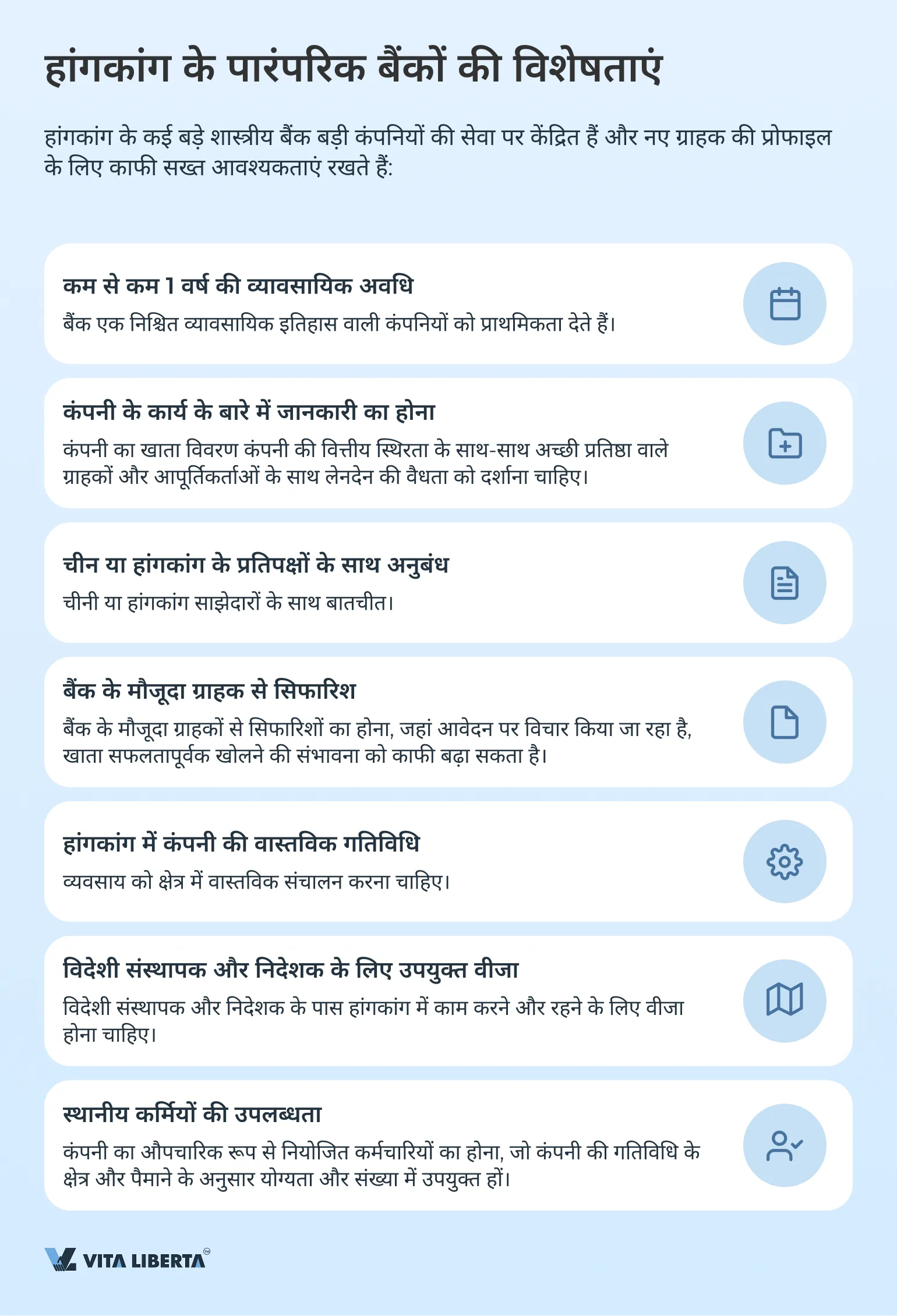हांगकांग के कई बड़े शास्त्रीय बैंक बड़े निगमों की सेवा पर केंद्रित हैं और नए संभावित ग्राहक की प्रोफाइल के लिए सख्त आवश्यकताएं रखते हैं। सबसे पहले, कंपनियों का कम से कम एक वर्ष का कार्य इतिहास होना चाहिए, क्योंकि बैंक एक निश्चित प्रतिष्ठा और स्थिरता वाले संगठनों के साथ काम करना पसंद करते हैं। कंपनी की गतिविधियों के बारे में विस्तृत जानकारी का होना भी महत्वपूर्ण है: खाता विवरण को वित्तीय स्थिरता और अच्छी प्रतिष्ठा वाले ग्राहकों और आपूर्तिकर्ताओं के साथ लेनदेन की वैधता प्रदर्शित करनी चाहिए।