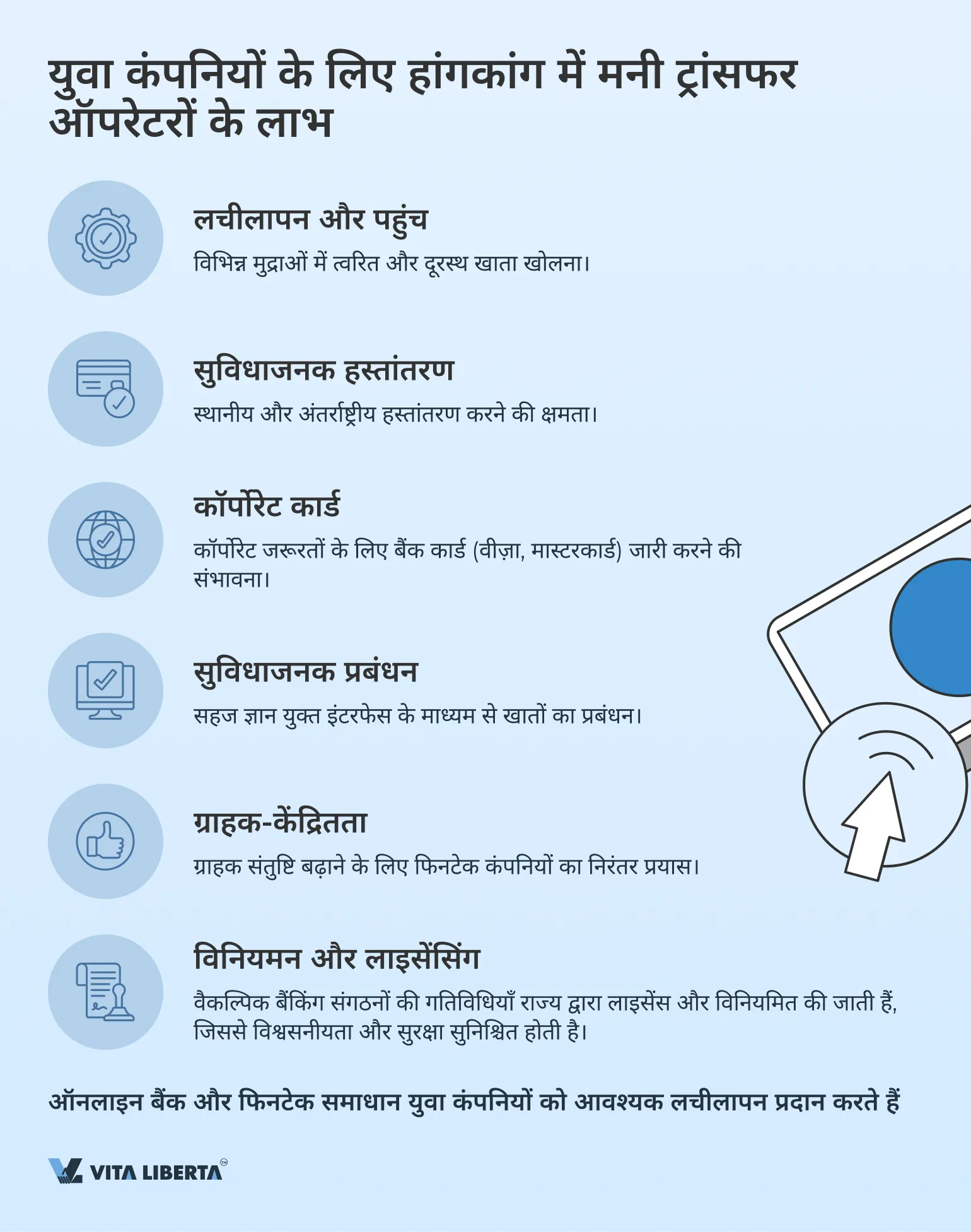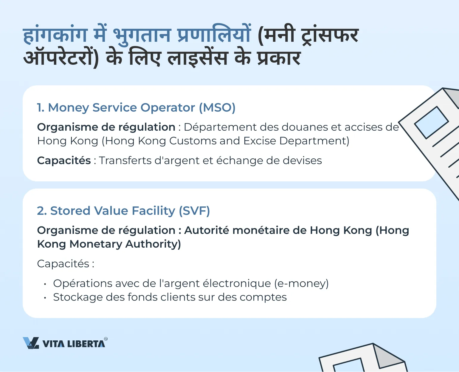 - मनी सर्विस ऑपरेटर (एमएसओ) — यह लाइसेंस हांगकांग कस्टम्स एंड एक्साइज डिपार्टमेंट (Hong Kong Customs and Excise Department) द्वारा जारी और विनियमित किया जाता है। एमएसओ लाइसेंस कंपनियों को धन हस्तांतरण और मुद्रा विनिमय करने की अनुमति देता है, जिससे व्यवसाय के लिए लचीलापन और सुविधा सुनिश्चित होती है।