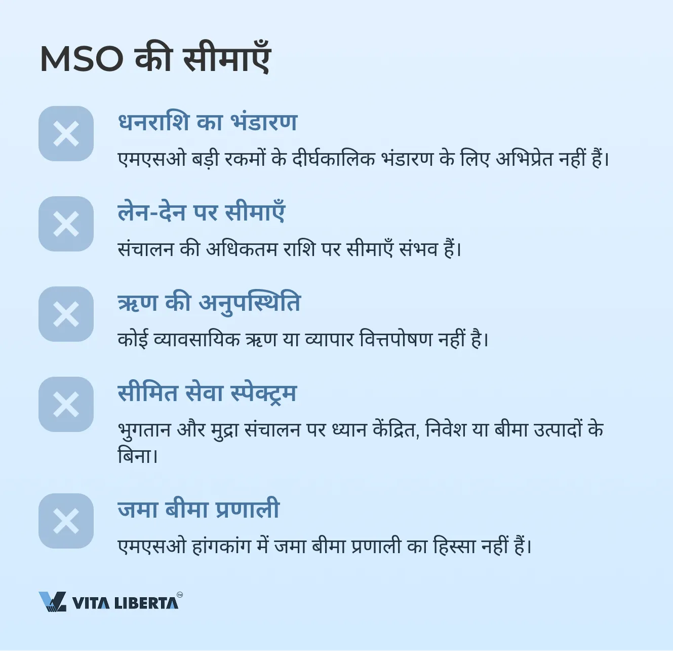• एमएसओ व्यावसायिक ऋण या व्यापार वित्तपोषण सेवाएं प्रदान नहीं करते हैं।