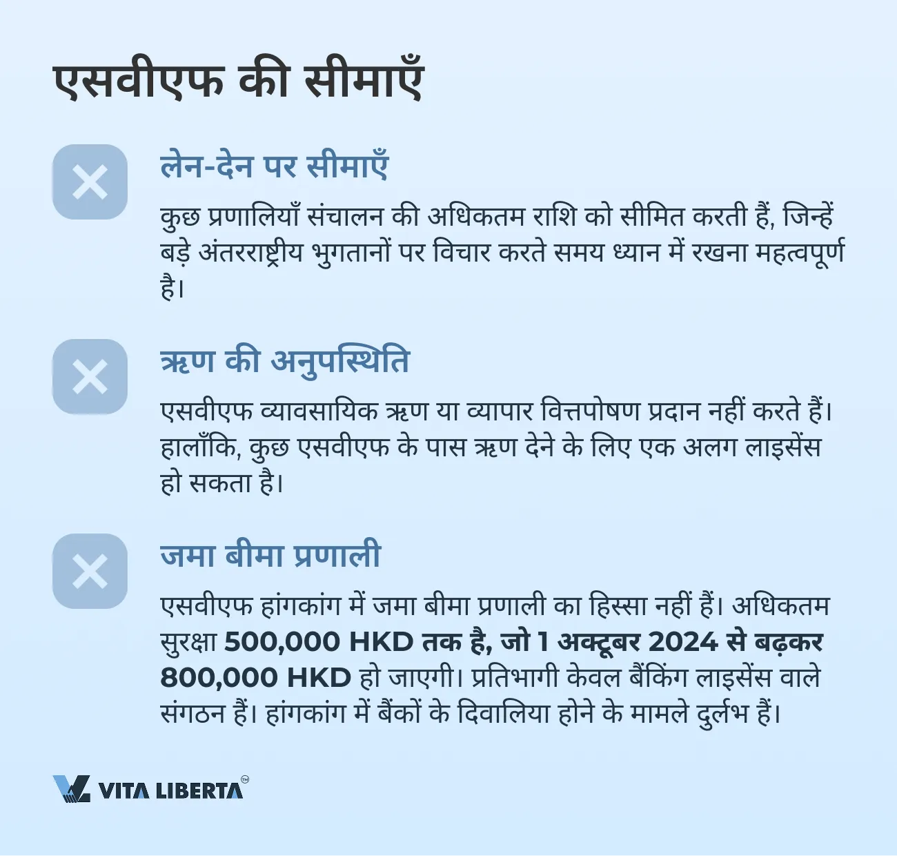 • एसवीएफ हांगकांग में जमा बीमा प्रणाली का हिस्सा नहीं हैं। अधिकतम सुरक्षा 500,000 HKD तक है, जो 1 अक्टूबर 2024 से बढ़कर 800,000 HKD हो जाएगी। प्रतिभागी केवल बैंकिंग लाइसेंस वाले संगठन हैं। हांगकांग में बैंकों के दिवालिया होने के मामले दुर्लभ हैं।