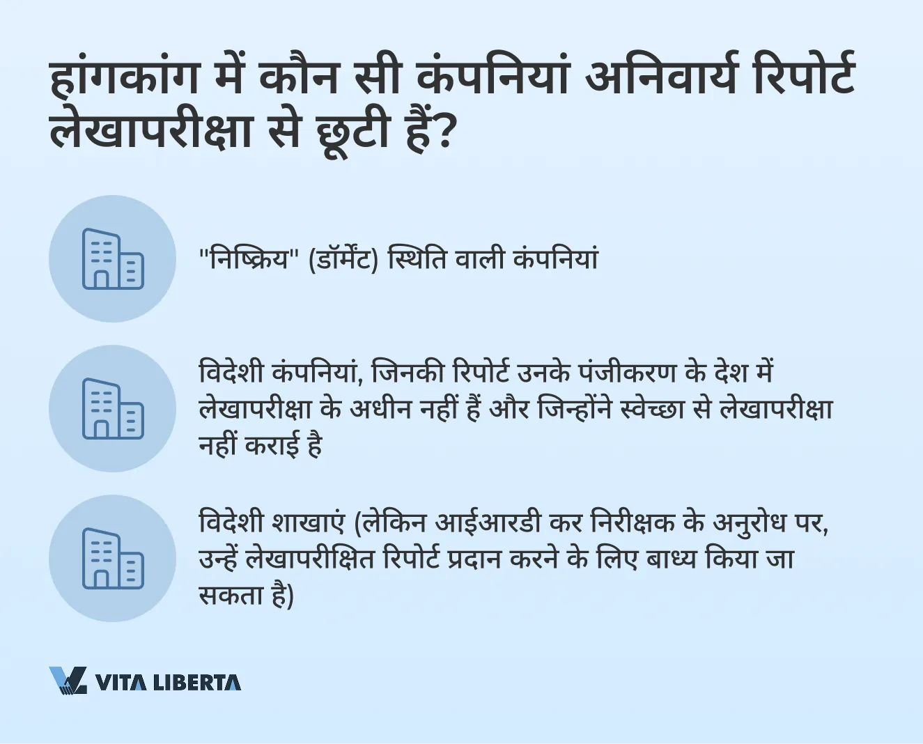 हांगकांग कंपनी के गतिविधि न होने का तथ्य, जिसके संस्थापकों और प्रबंधन ने विशेष प्रस्ताव पारित नहीं किए हैं और हांगकांग कंपनी रजिस्टर को निष्क्रिय स्थिति के बारे में सूचित नहीं किया है, वह कारण नहीं है जिसके आधार पर कंपनी अनिवार्य रिपोर्ट लेखापरीक्षा से छूट सकती है।