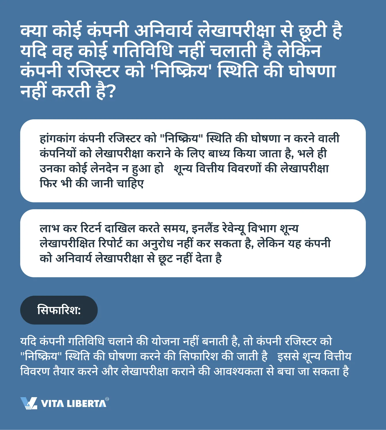 यह समझना महत्वपूर्ण है कि एक “निष्क्रिय” कंपनी, उस कंपनी से अलग होती है जो अस्थायी रूप से कोई गतिविधि नहीं चलाती है। “निष्क्रिय” कंपनी की स्थिति कंपनी के भीतर औपचारिक रूप से स्थापित की जाती है और हांगकांग कंपनी अध्यादेश के अध्याय 622 के खंड 447 के अनुसार कंपनी रजिस्टर में आधिकारिक रूप से घोषित की जाती है। केवल इस स्थिति में ही कंपनी अनिवार्य रिपोर्ट लेखापरीक्षा के संबंध में विनियामक राहत का दावा कर सकती है। जबकि एक निष्क्रिय कंपनी को बिना किसी अपवाद के सभी कानूनी आवश्यकताओं का पालन करना चाहिए।