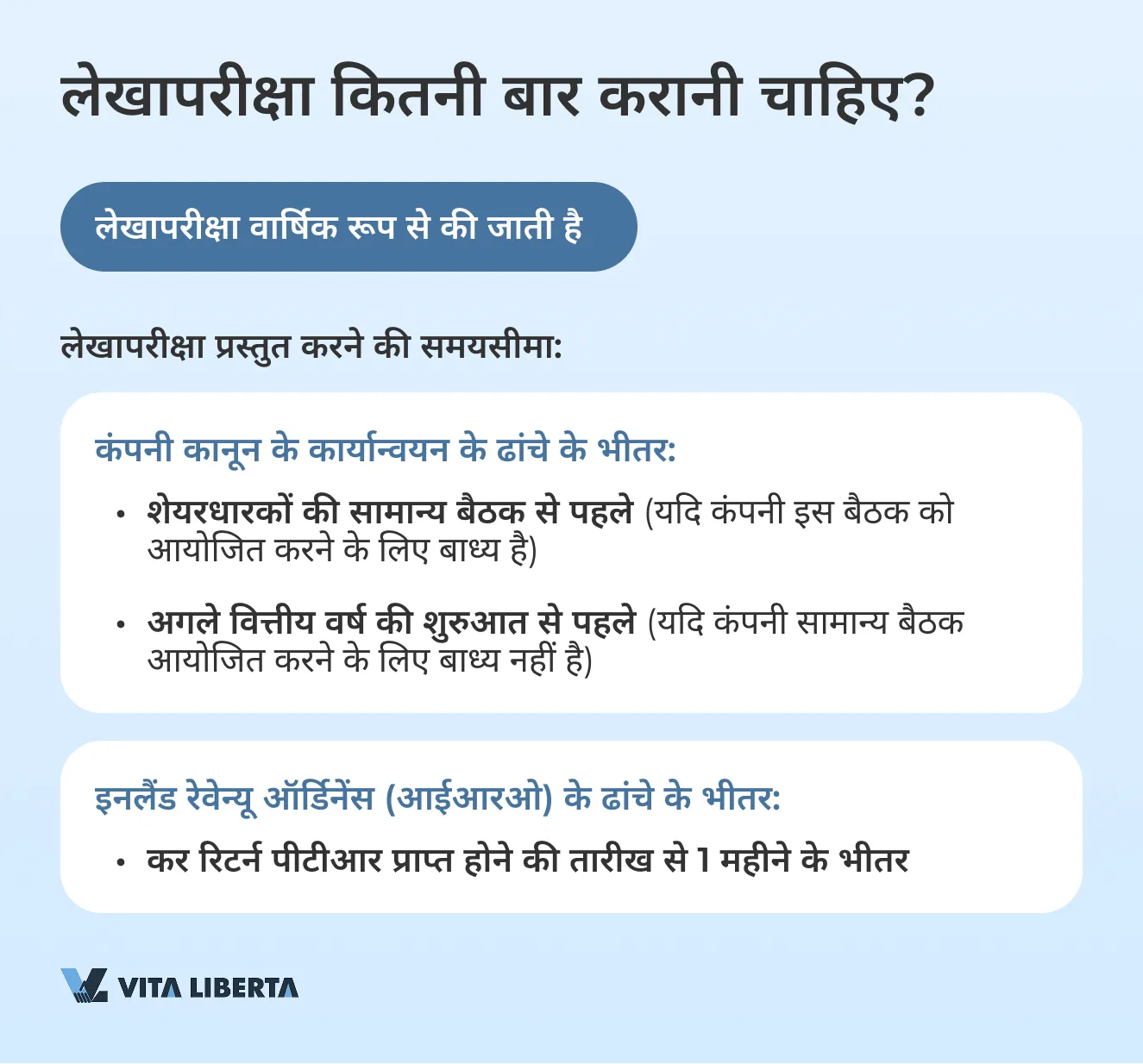 | तैयारी और प्रस्तुतीकरण की समयसीमा | वित्तीय वर्ष समाप्त होने के 9 महीने के भीतर। लेखापरीक्षक परिवर्तन के मामले में, नए को 1 महीने के भीतर नियुक्त किया जाना चाहिए। | पीटीआर प्राप्त होने के 1 महीने के भीतर। कुछ शर्तों के तहत और अनुरोध पर, समय सीमा बढ़ाई जा सकती है। |
