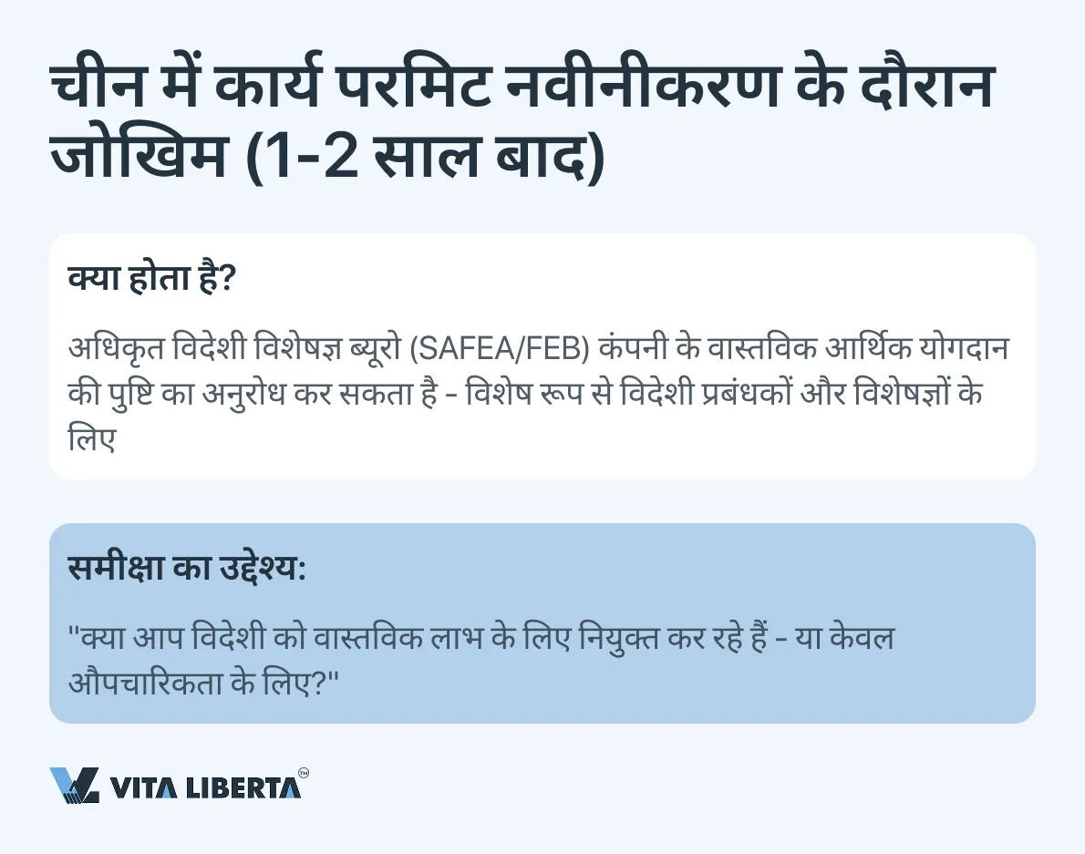प्रारंभिक प्रसंस्करण के लगभग 1-2 साल बाद, ‘विदेशियों के लिए कार्य अनुमति’ के नवीनीकरण प्रक्रिया के दौरान, विदेशी विशेषज्ञ मामलों का अधिकृत ब्यूरो (FEB/SAFEA) नियोक्ता कंपनी की वास्तविक आर्थिक गतिविधि और विदेशी प्रबंधक की निरंतर उपस्थिति की समीचीनता की गहन समीक्षा शुरू कर सकता है। समीक्षा का उद्देश्य यह पुष्टि करना है कि विदेशी कर्मियों की भर्ती स्थानीय अर्थव्यवस्था को ठोस लाभ पहुंचाती है।
