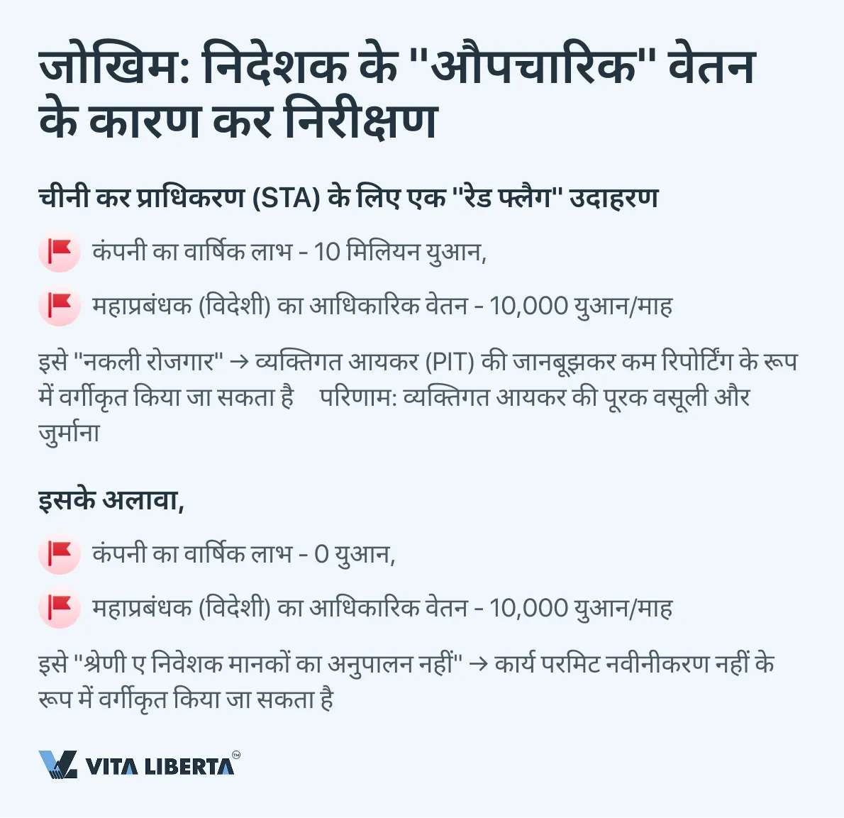 विदेशी भागीदारी वाली कंपनियों की गतिविधियों पर कर निगरानी के ढांचे के भीतर, चीनी कर अधिकारी प्रमुख प्रबंधकों (विशेष रूप से संस्थापक-महाप्रबंधकों) के रोजगार अनुबंधों की शर्तों के आर्थिक वास्तविकता और बाजार मानकों के अनुपालन के विश्लेषण पर विशेष ध्यान देते हैं। स्थिति जहां कंपनी के एकमात्र कार्यकारी निकाय (जैसे महाप्रबंधक) का आधिकारिक वेतन केवल 10,000 युआन प्रति माह है, जबकि कानूनी इकाई का वार्षिक शुद्ध लाभ 10 मिलियन युआन तक पहुंच जाता है, ऐसी स्थिति को “नकली रोजगार” की विशेषताओं वाली एक योजना के रूप में देखे जाने की बहुत अधिक संभावना है।