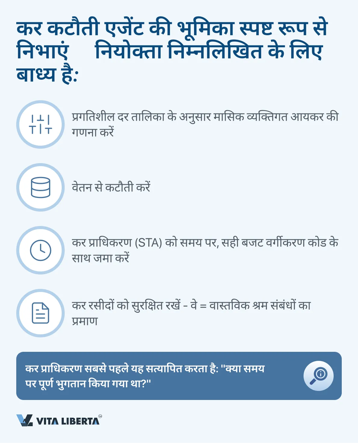 - कर निरीक्षण: बाजार के अनुरूप वेतन निर्धारित करने, कर एजेंट के कर्तव्यों का निर्दोष पालन और वार्षिक कर निपटान (Tax Settlement) पूरा करने से इस जोखिम को कम किया जा सकता है।