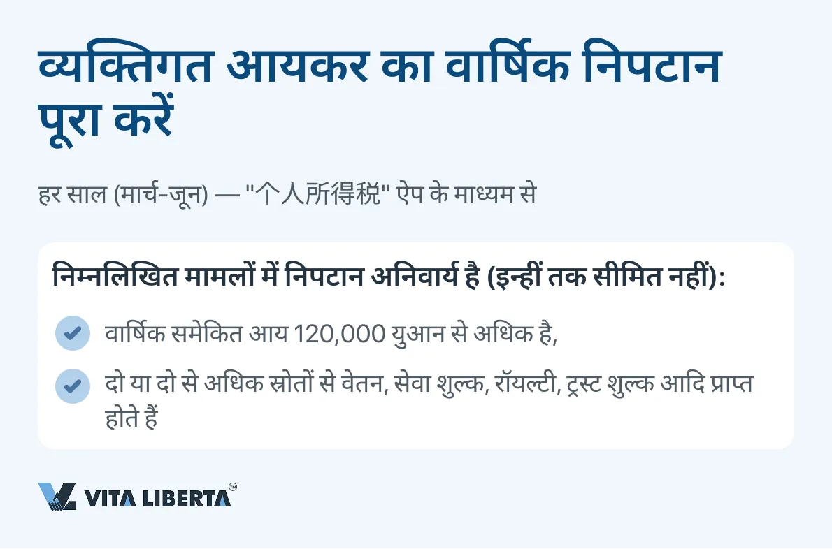 प्रत्येक कैलेंडर वर्ष के अंत में, महाप्रबंधक (कई स्रोतों से आय प्राप्त करने वाले या 120,000 युआन से अधिक की कुल वार्षिक आय वाले किसी भी कर निवासी की तरह) को “个人所得税” प्लेटफॉर्म के माध्यम से व्यक्तिगत आयकर का अंतिम निपटान पूरा करना चाहिए।