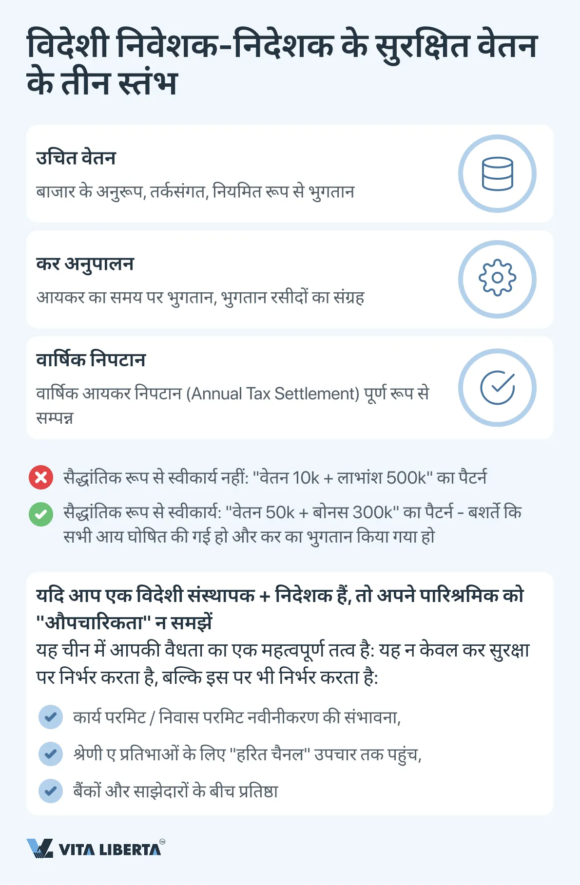 समाधान: पद, उद्योग और क्षेत्र के अनुरूप बाजार के हिसाब से वेतन निर्धारित करें (उदाहरण के लिए, हांग्जो में IT में 35,000 युआन/माह से)। नियोक्ता को NDFL का ठीक से भुगतान करना चाहिए, और निदेशक को “个人所得税” ऐप में वार्षिक कर निपटान (Annual Tax Settlement) पूरा करना चाहिए।