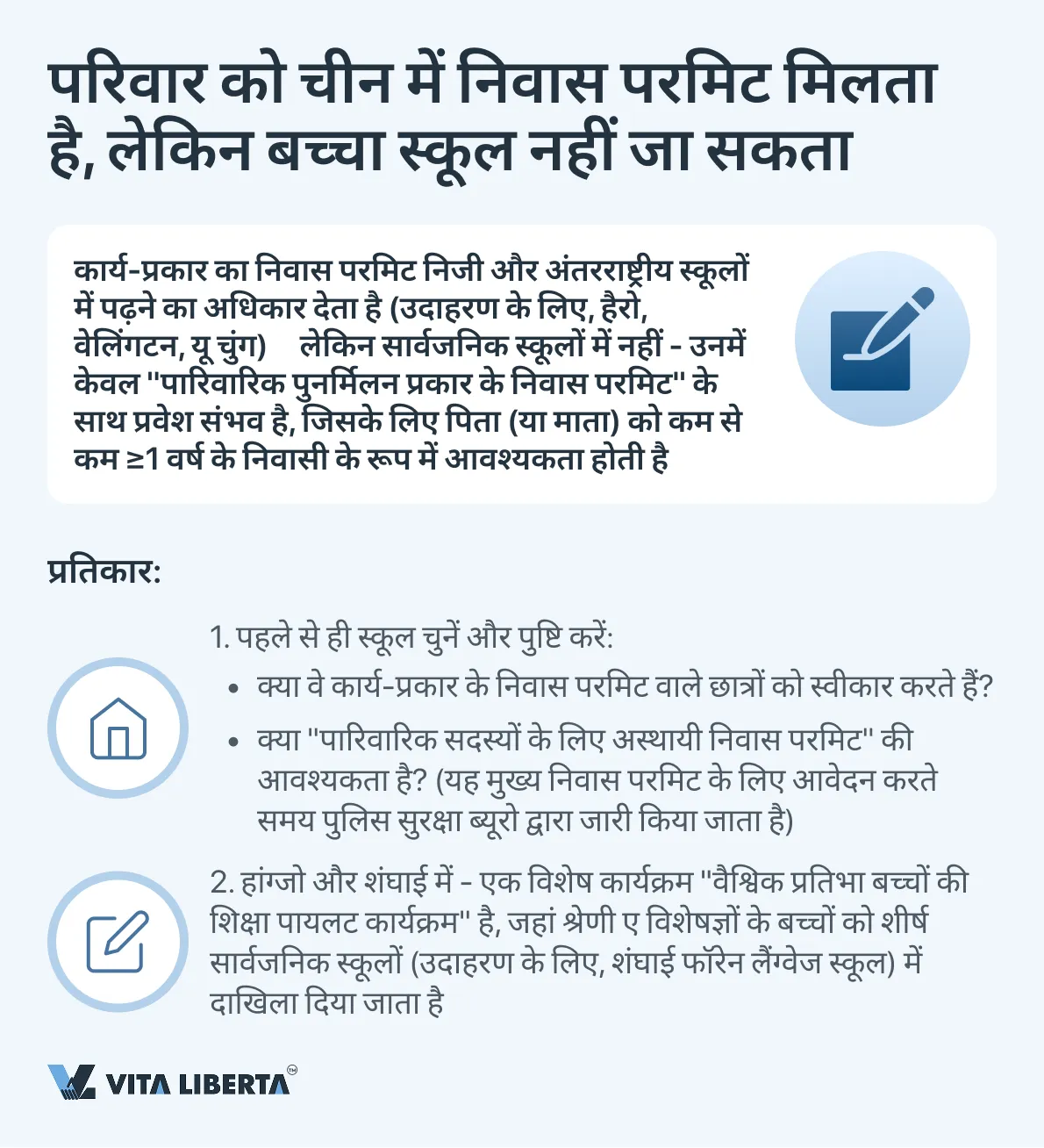 समाधान: 1) पहले से चुने हुए स्कूल के साथ समझौता करें और अस्थायी आश्रित परिवार के सदस्य निवास परमिट (Temporary Residence Permit for Accompanying Family Members) के लिए आवेदन करें। 2) उच्च योग्यता वाले विशेषज्ञों (श्रेणी A) के लिए क्षेत्रीय कार्यक्रमों के बारे में पता करें, उदाहरण के लिए, शंघाई/हांग्जो में ग्लोबल टैलेंट चिल्ड्रन एजुकेशन पायलट। 3) भविष्य में पारिवारिक निवास परमिट (Reunion-type) में बदलें, जो पूर्ण पहुंच खोलता है।