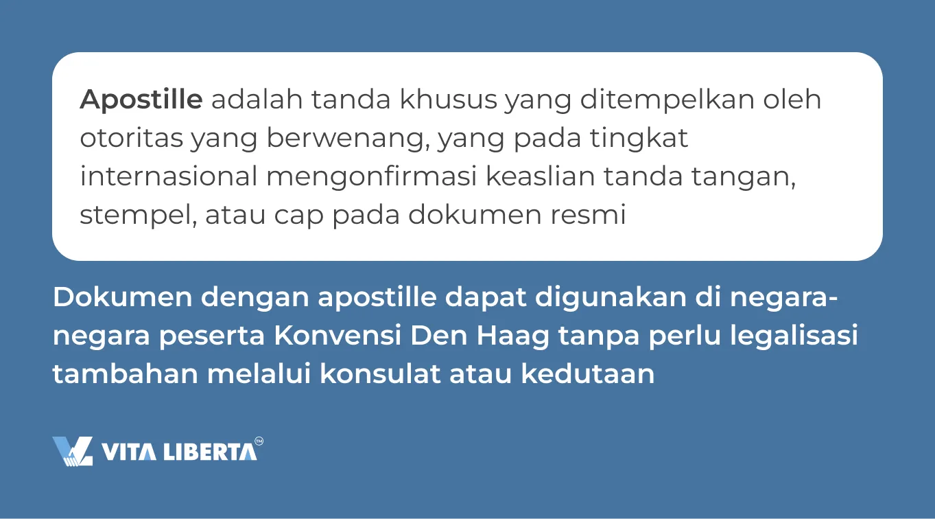 Apostille adalah stempel khusus yang mengkonfirmasi keaslian tanda tangan, stempel, atau cap pada dokumen, serta kekuatan hukumnya untuk digunakan di negara lain yang berpartisipasi dalam Konvensi Den Haag. Apostille menghilangkan kebutuhan akan legalisasi konsuler yang rumit, yang sangat menyederhanakan pertukaran dokumen internasional. Misalnya, dokumen korporat yang diapostille dapat digunakan untuk membuka rekening bank, berpartisipasi dalam tender, dan prosedur resmi lainnya di luar negeri.
