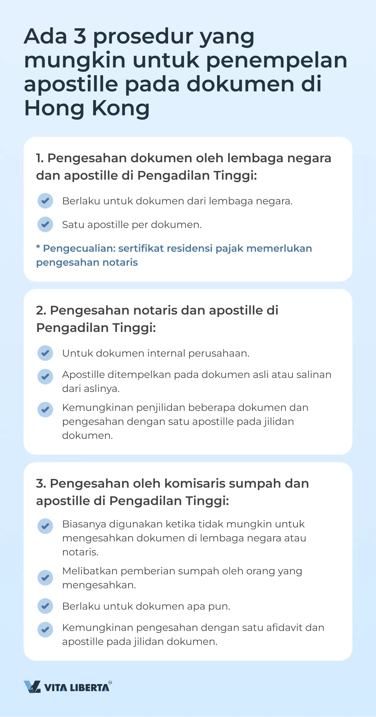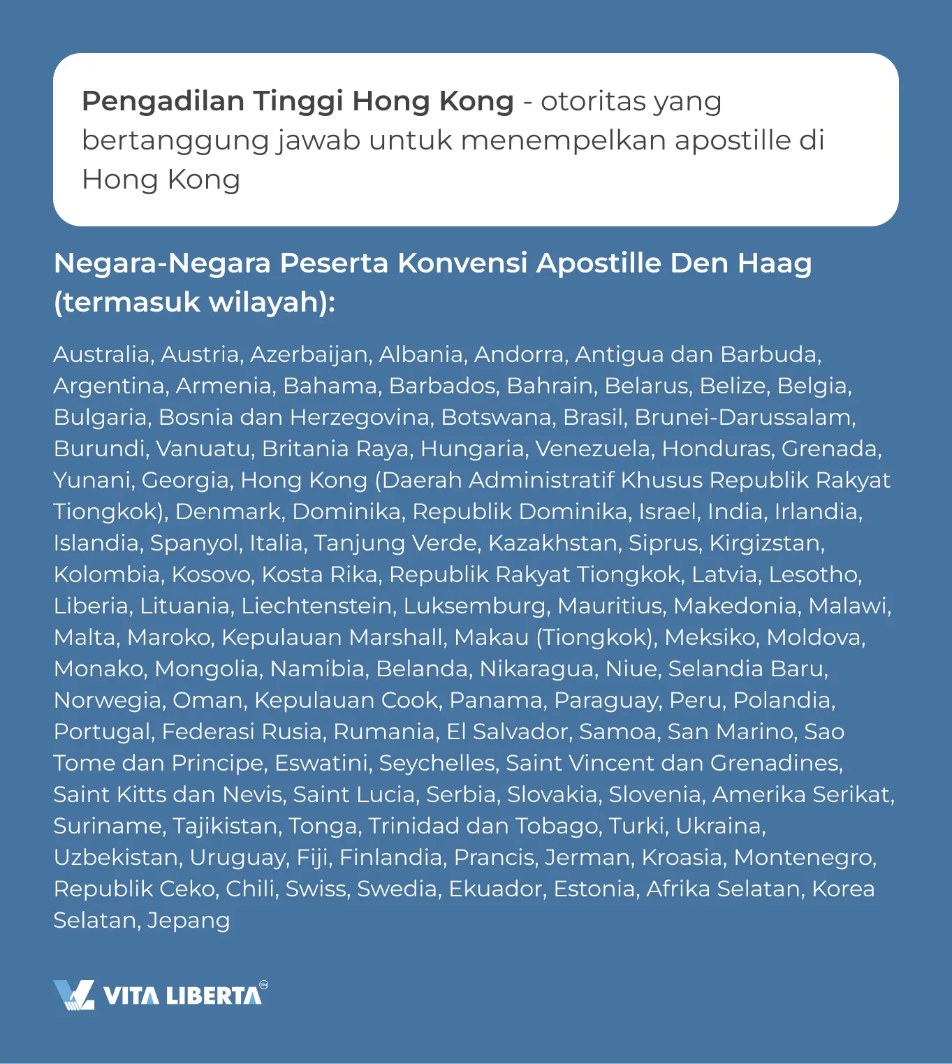 - Pengesahan dokumen oleh lembaga negara yang menerbitkannya dan penempelan apostille di Pengadilan Tinggi Hong Kong.
