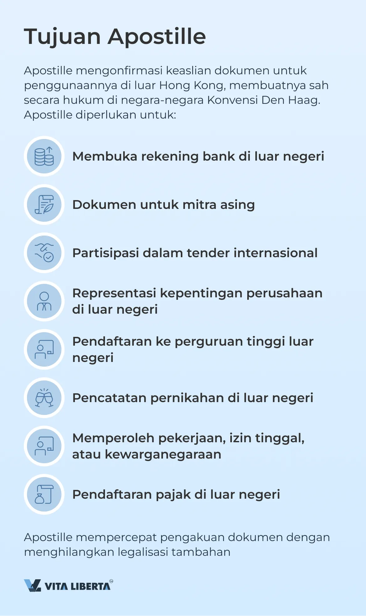 Apostille dokumen diperlukan untuk pengakuan resmi dan penggunaannya di luar Hong Kong. Apostille mengonfirmasi keaslian dokumen dan membuatnya sah secara hukum di negara lain yang menandatangani Konvensi Den Haag. Kasus utama di mana apostille diperlukan, meliputi: