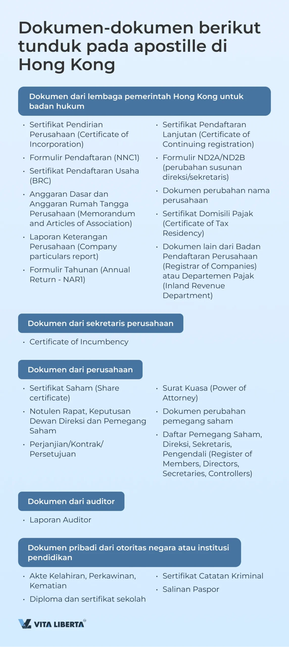 Berbagai dokumen korporat tunduk pada apostille di Hong Kong, termasuk: