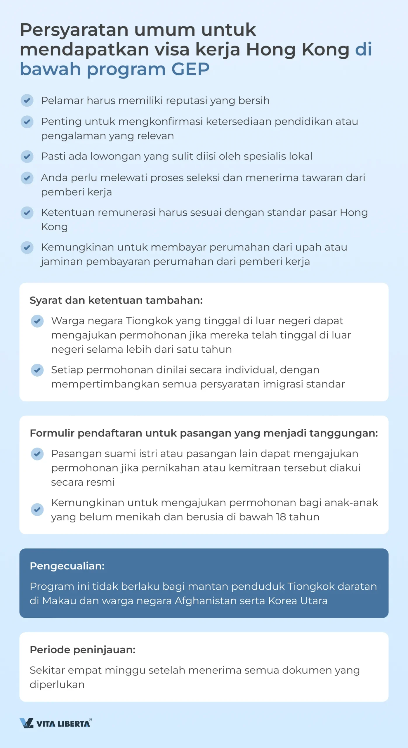 Bekerja dan tinggal di Hong Kong menarik banyak warga asing berkat ekonominya yang maju, standar hidup yang tinggi, dan status internasionalnya. Namun, pekerjaan legal dan tempat tinggal jangka panjang memerlukan visa kerja, yang kemudian membuka pintu menuju tempat tinggal permanen. Dalam artikel ini, kami menjelaskan setiap langkah aplikasi secara detail, beserta persyaratan dan kiat aplikasi visa, serta membahas kesalahan umum yang harus dihindari.