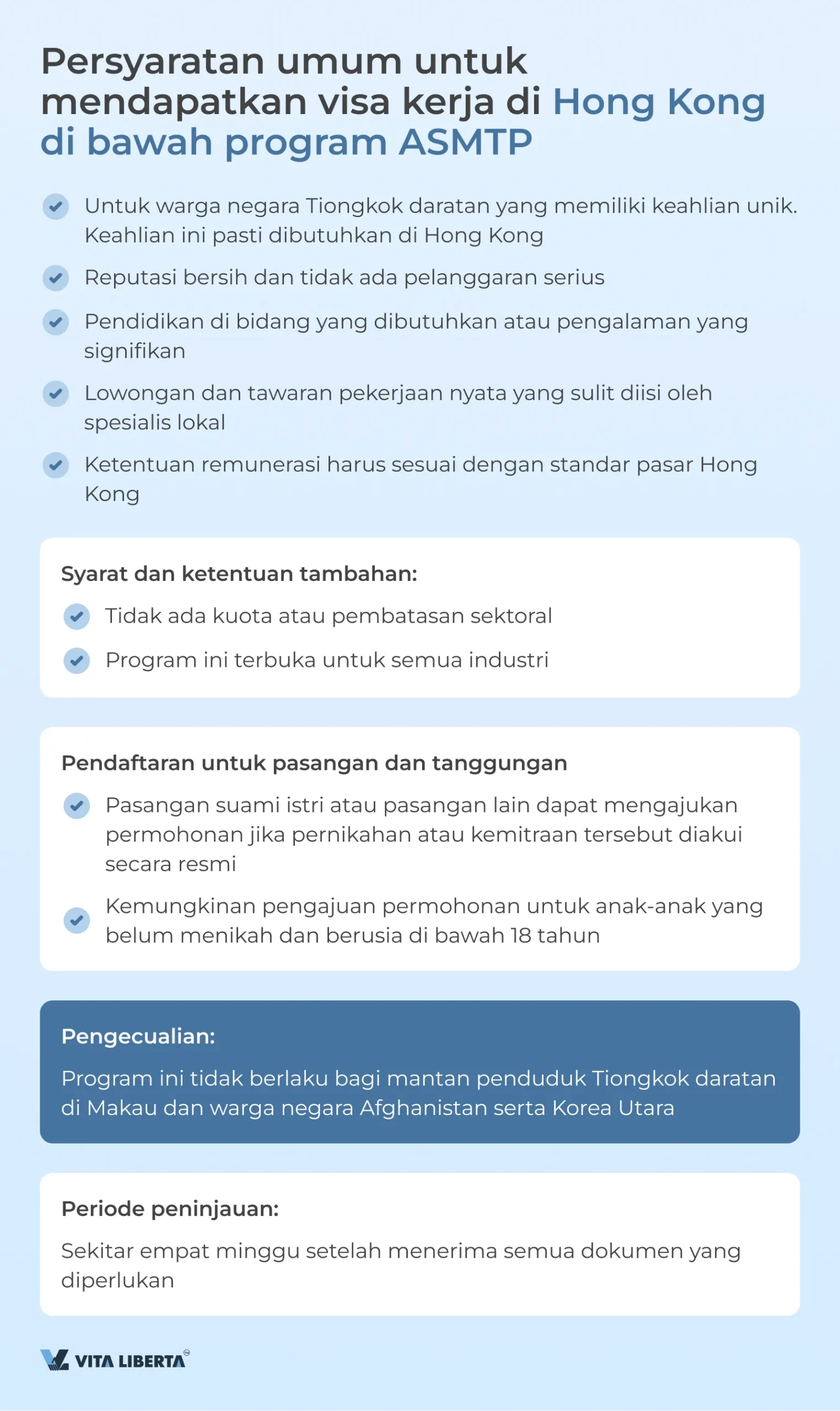 Program ASMTP ditujukan bagi para profesional terampil dari Tiongkok daratan, yang mendukung industri-industri kunci yang vital bagi perekonomian Hong Kong. Untuk mendapatkan visa ASMTP, pelamar harus menunjukkan pengalaman kerja dan kualifikasi yang relevan untuk posisi tertentu.