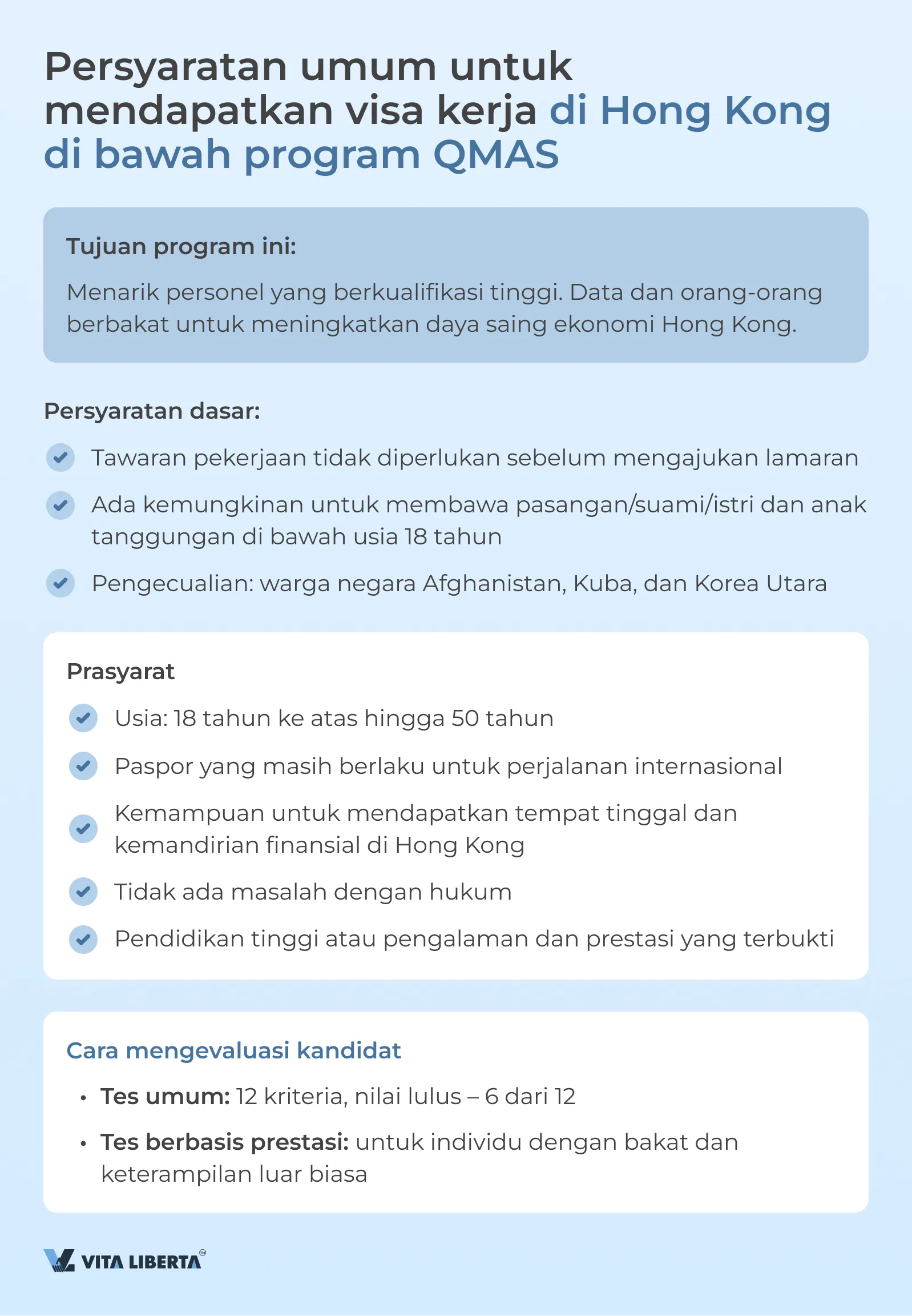 QMAS beroperasi berdasarkan sistem poin yang mengevaluasi faktor-faktor seperti pendidikan, pengalaman profesional, dan kemampuan berbahasa. Program ini dirancang untuk para profesional yang berkualifikasi tinggi yang dapat berkontribusi pada pembangunan Hong Kong. Keunggulan utama QMAS adalah kemampuan untuk mendapatkan visa tanpa terikat pada pemberi kerja tertentu.