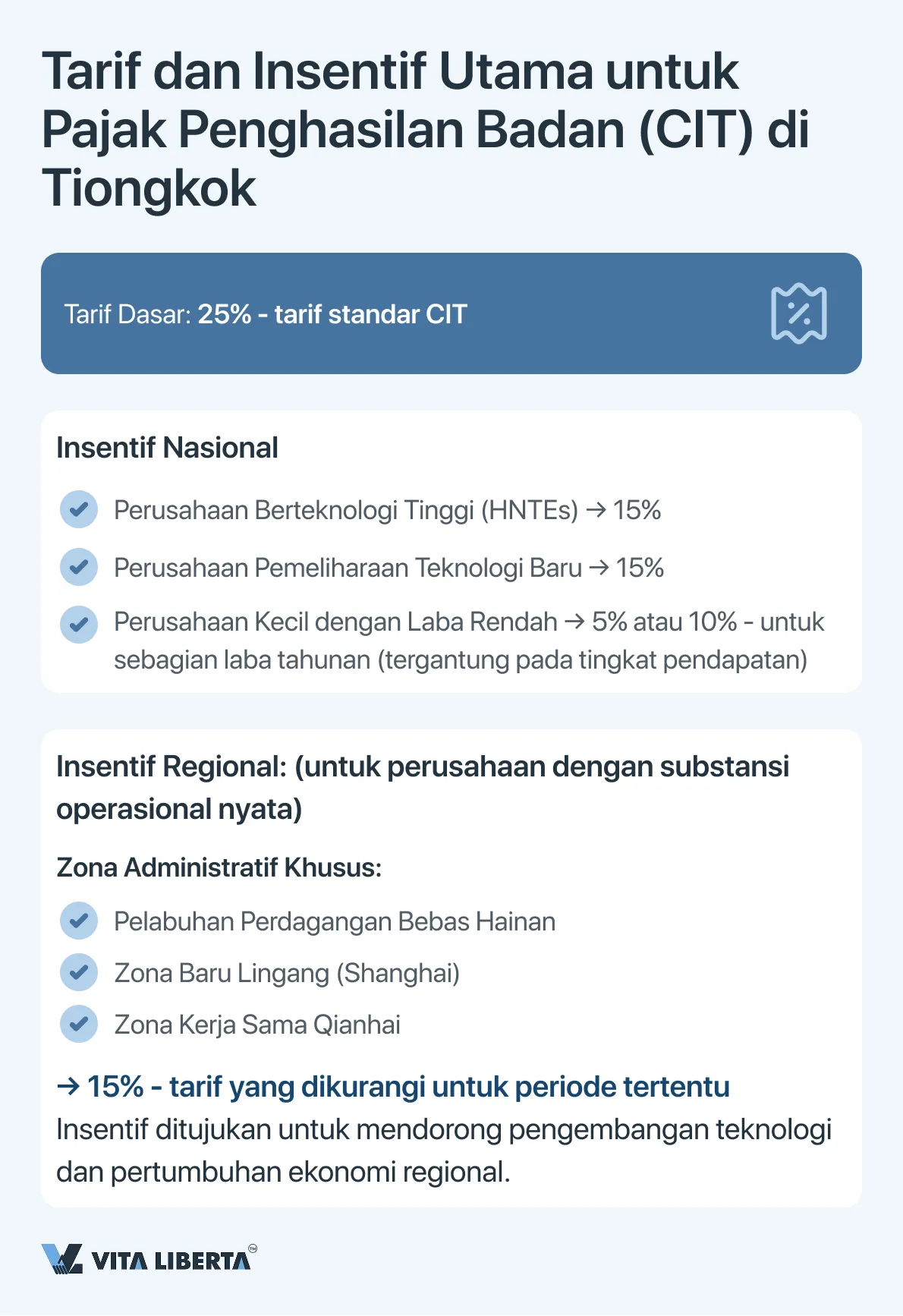 Insentif Regional: Zona Administratif Khusus (misalnya, Pelabuhan Perdagangan Bebas Hainan, Zona Baru Lingang di Shanghai, Zona Kerja Sama Qianhai) menawarkan tarif 15% untuk periode tertentu kepada perusahaan yang didorong dengan substansi operasional nyata (operational substance).