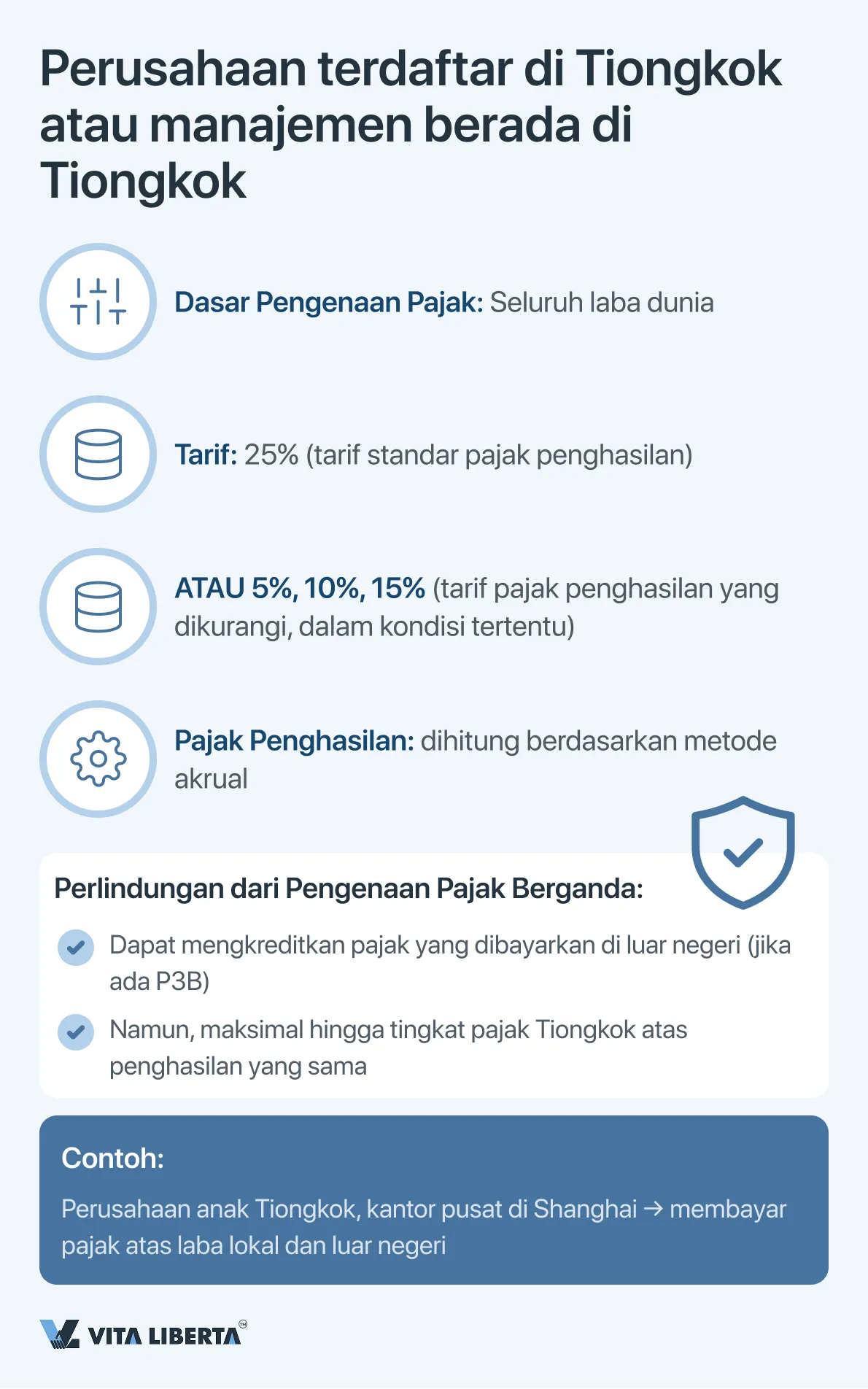 - Jika terdapat Bentuk Usaha Tetap (BUT) di Tiongkok: Pajak dikenakan atas laba yang diperoleh melalui BUT tersebut, serta penghasilan yang diperoleh di luar BUT tetapi secara efektif terkait dengan aktivitas BUT tersebut.