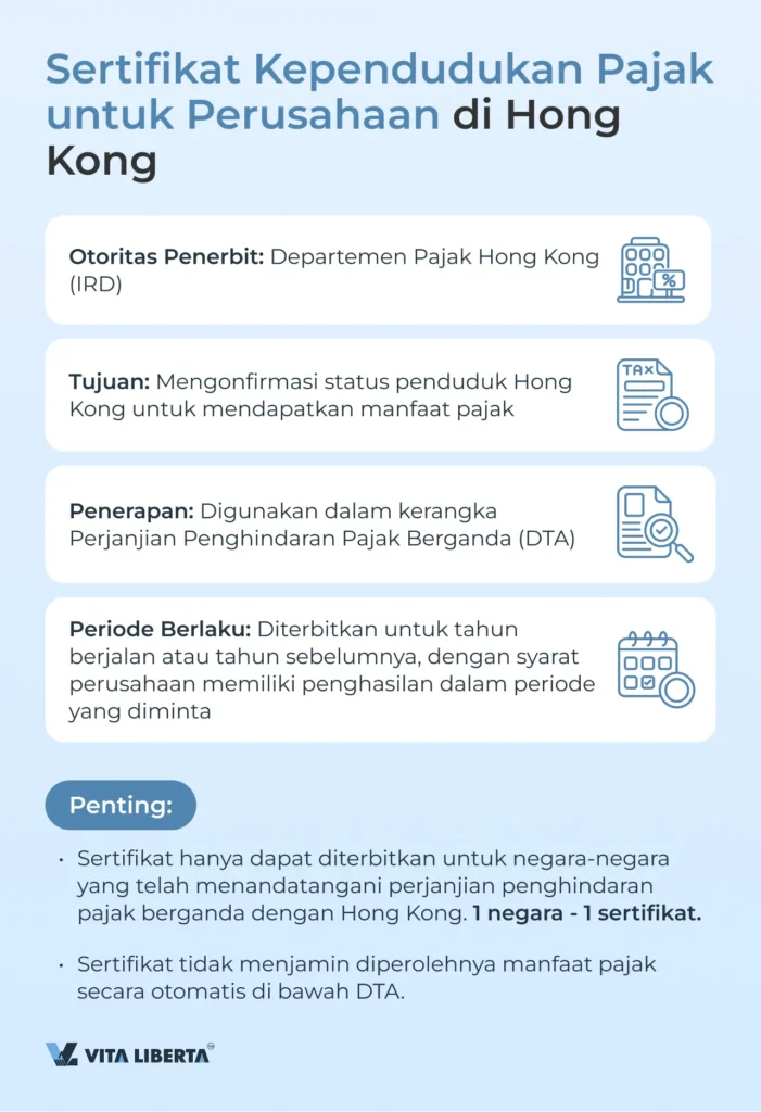 Sertifikat ini berfungsi sebagai bukti status penduduk Hong Kong dan dapat dikeluarkan untuk tahun berjalan atau tahun sebelumnya terkait negara yang telah menandatangani perjanjian penghindaran pajak berganda dengan Hong Kong. Penting untuk dicatat bahwa memperoleh Sertifikat Kependudukan Pajak itu sendiri tidak menjamin pemberian manfaat yang diatur dalam perjanjian penghindaran pajak berganda.