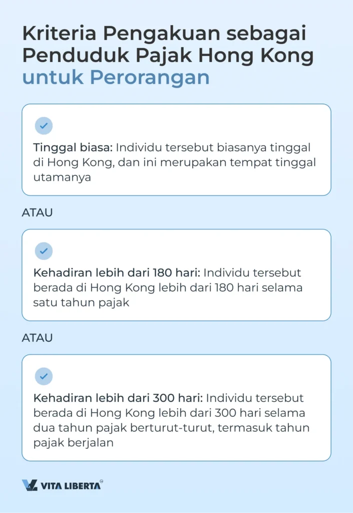 - Kehadiran lebih dari 180 hari dalam setahun: Individu tersebut berada di Hong Kong lebih dari 180 hari selama satu tahun.
