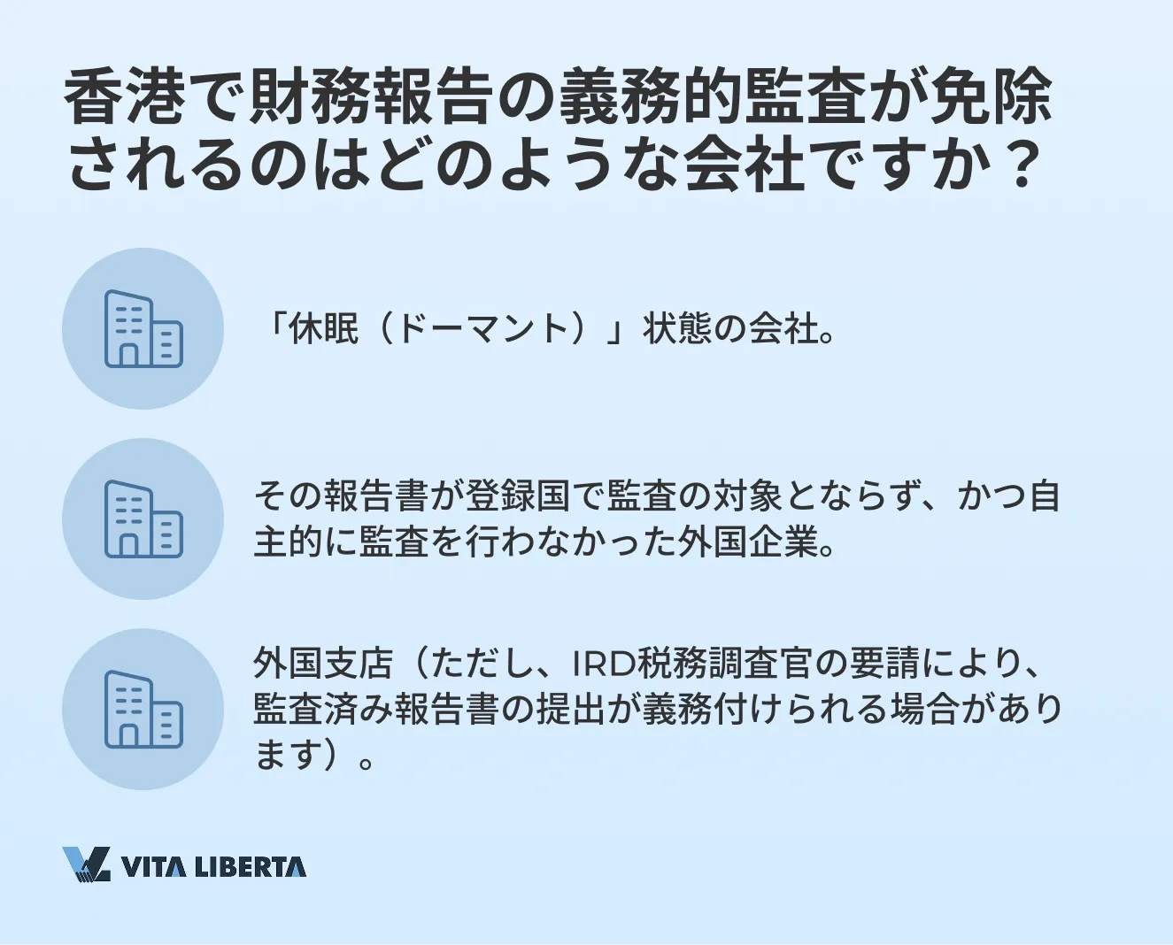 | 免除対象 | 「休眠(ドーマント)」会社 | 「休眠(ドーマント)」会社;報告書の義務監査を規定しておらず、かつ自主的に監査を行っていない国に登録された会社;香港における外国企業の支店(必要に応じ税務調査官から要求される場合あり)。 |