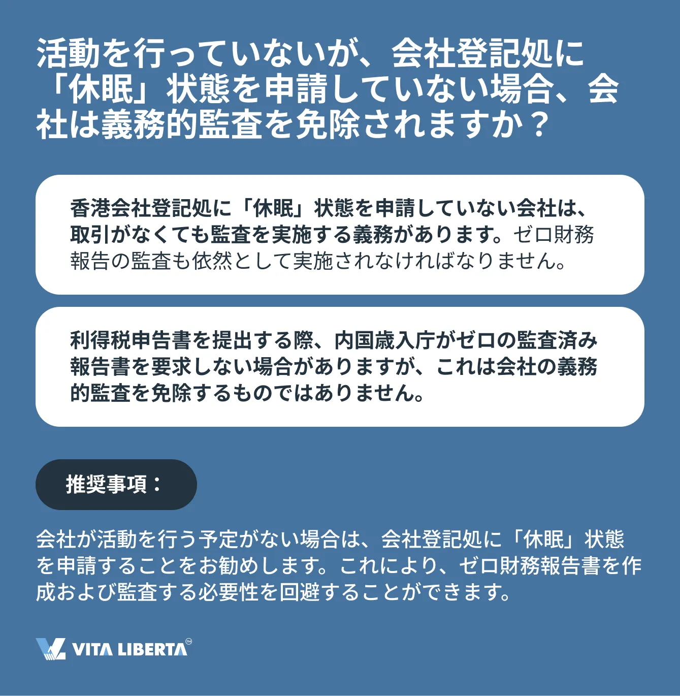 重要な点は、「休眠」会社が、一時的に活動を行っていない会社とは異なるということです。「休眠」会社のステータスは、香港会社条例第622章第447条に従い、会社内で正式に設定され、会社登記処に正式に宣言されます。この場合にのみ、会社は財務報告の義務的監査に関する規制上の緩和を申請することができます。一方、非活動会社は例外なくすべての法的要件を遵守しなければなりません。
