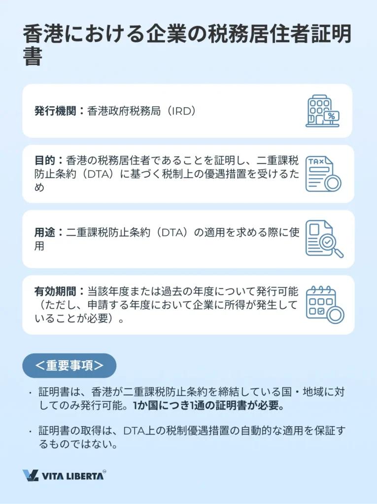 この証明書は、香港の税務居住者であることを裏付けるものであり、条約締結国との間でDTA上の優遇措置を申請する際の要件として用いられます。証明書は、当該年度または過去の年度について発行が可能ですが、証明書の申請対象となる年度において、企業に実際の所得が発生していることが条件となります。