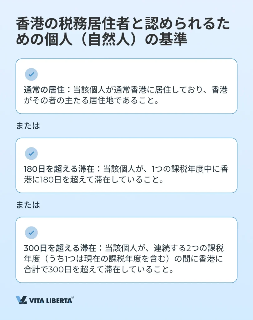 個人の場合:香港における通常の居住、または1暦年中に180日を超えて香港に滞在すること、または連続する2暦年(うち1年は当該年度を含む)の間に合計300日を超えて香港に滞在することが必要です。