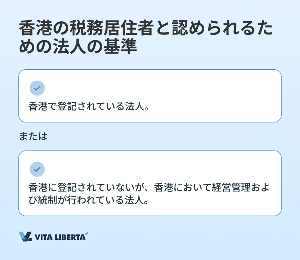 法人の場合:香港で会社が登記されていること、または登記されていない場合、その会社の経営管理および統制が香港で行われていることが必要です。