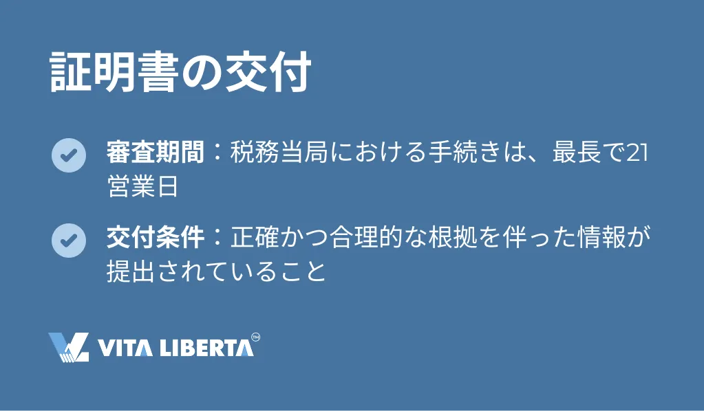 手続きは以下のステップで構成されます:必要書類の準備、申請書の記入および提出、税務当局による審査、および証明書の交付。審査の遅延を避けるためには、正確かつ合理的な根拠を伴った情報を提出することが重要です。