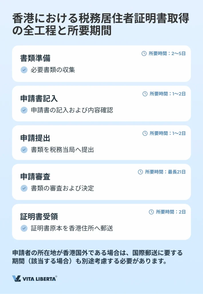 申請提出後、香港税務局は申請内容を審査し、必要に応じて追加情報の提出を求めることがあります。提出された情報が正確かつ合理的な根拠を伴っている場合、税務当局は証明書を交付します。通常、申請の審査プロセスは21営業日以内で完了します。