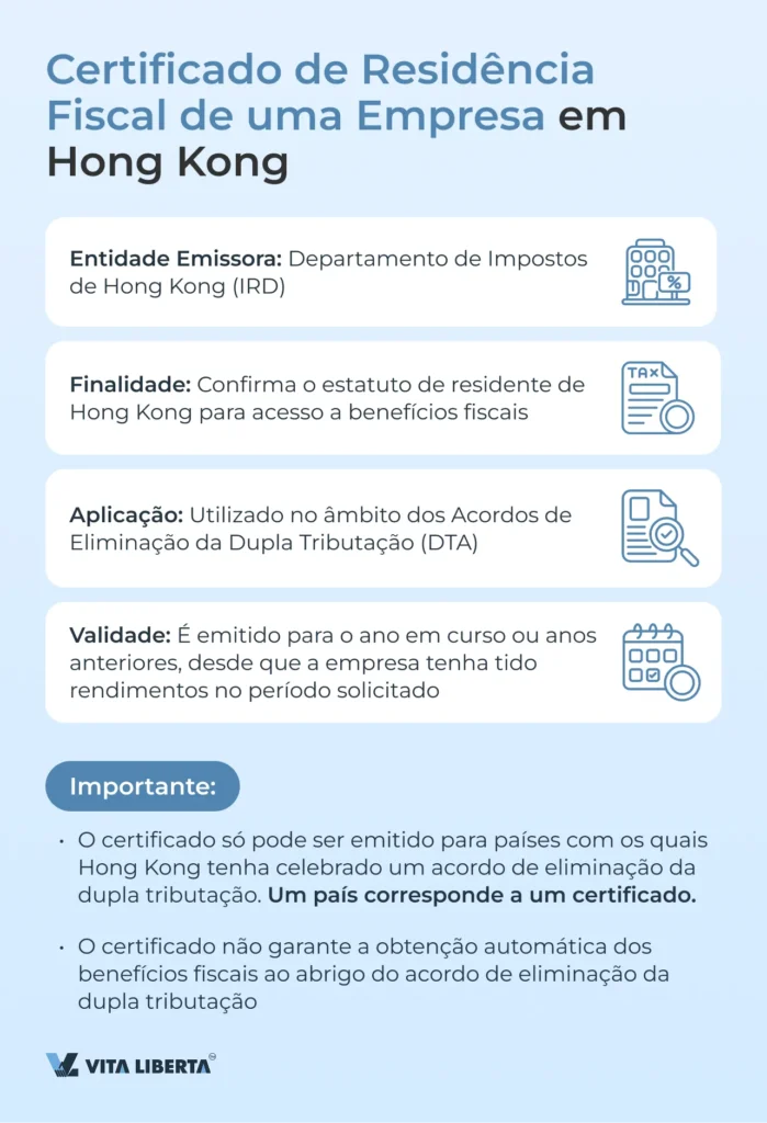 O Certificado de Residência Fiscal (Certificate of Residence, CoR) é um documento emitido pelo Departamento de Impostos de Hong Kong (Inland Revenue Department, IRD) que confirma o estatuto de residente para usufruir de benefícios fiscais ao abrigo dos acordos de eliminação da dupla tributação (DTA). Mais abaixo, detalhamos com quais países Hong Kong celebrou tais acordos.