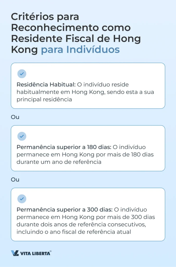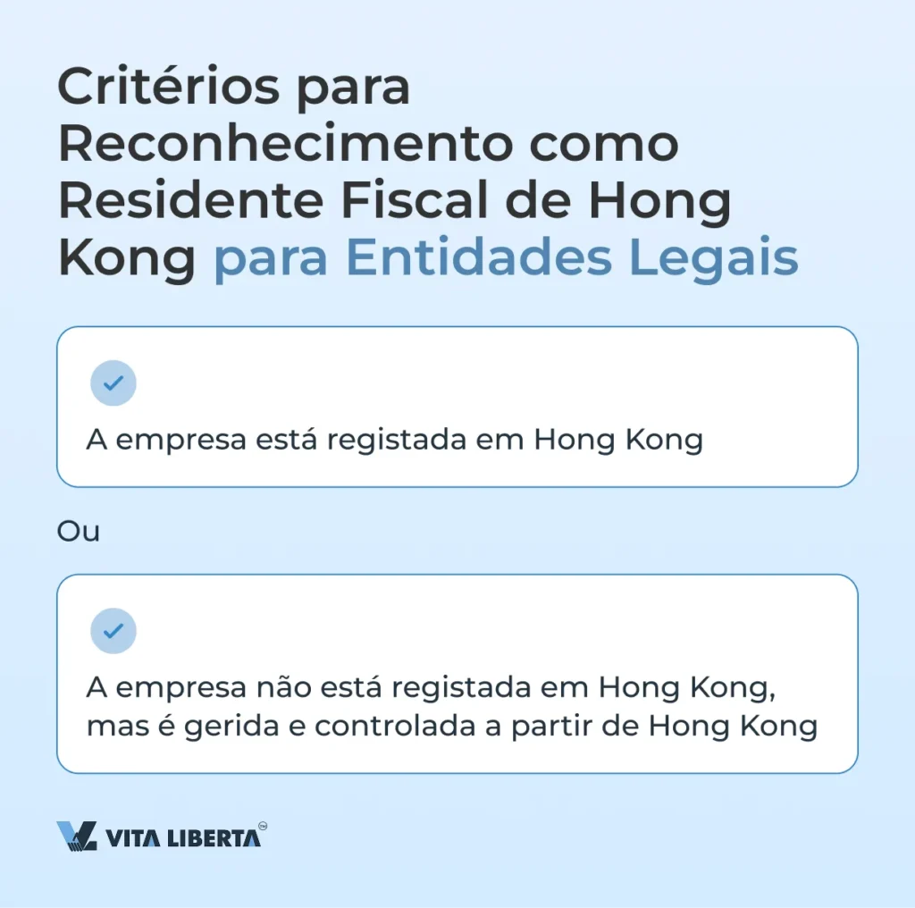 Para indivíduos: é necessário residência habitual em Hong Kong, ou permanência superior a 180 dias num ano, ou mais de 300 dias em dois anos. Para entidades legais: a empresa deve estar registada em Hong Kong ou ser gerida e controlada a partir de Hong Kong.