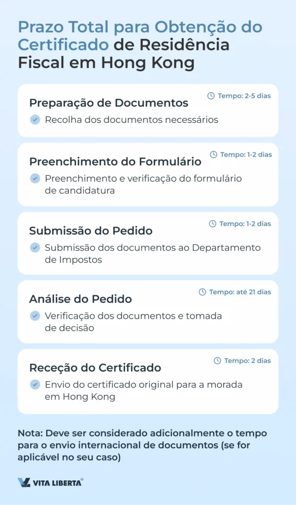 Após a submissão do pedido, o Departamento de Impostos de Hong Kong analisa o requerimento e, se necessário, solicita informação adicional. Se a informação fornecida estiver correta e fundamentada, os serviços fiscais emitem o certificado. Normalmente, o processo de análise do pedido demora até 21 dias úteis.