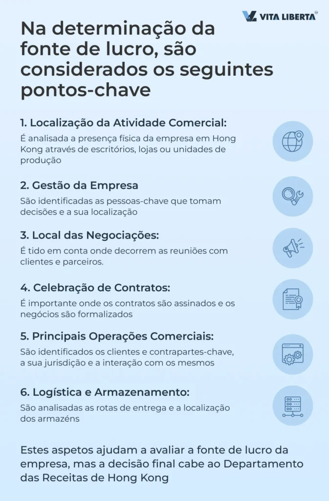 Localização da Atividade Comercial da Empresa: É necessário apurar se a empresa está representada no mercado de Hong Kong através da venda dos seus bens, realização de trabalhos ou prestação de serviços. Isto inclui a análise da presença física, como escritórios, lojas ou unidades de produção.