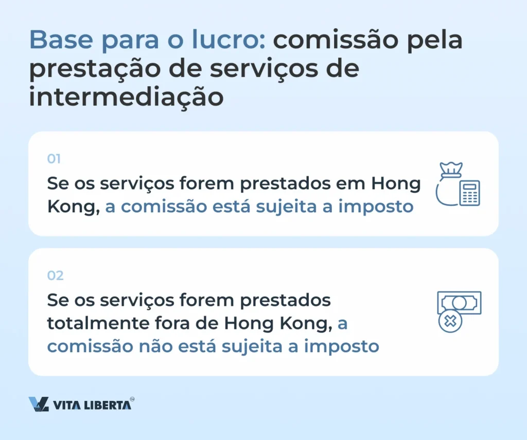 Se a sua atividade for exercida em Hong Kong, a fonte do rendimento é considerada Hong Kong. Se a atividade do agente for realizada totalmente fora do país, a comissão não está sujeita a imposto.